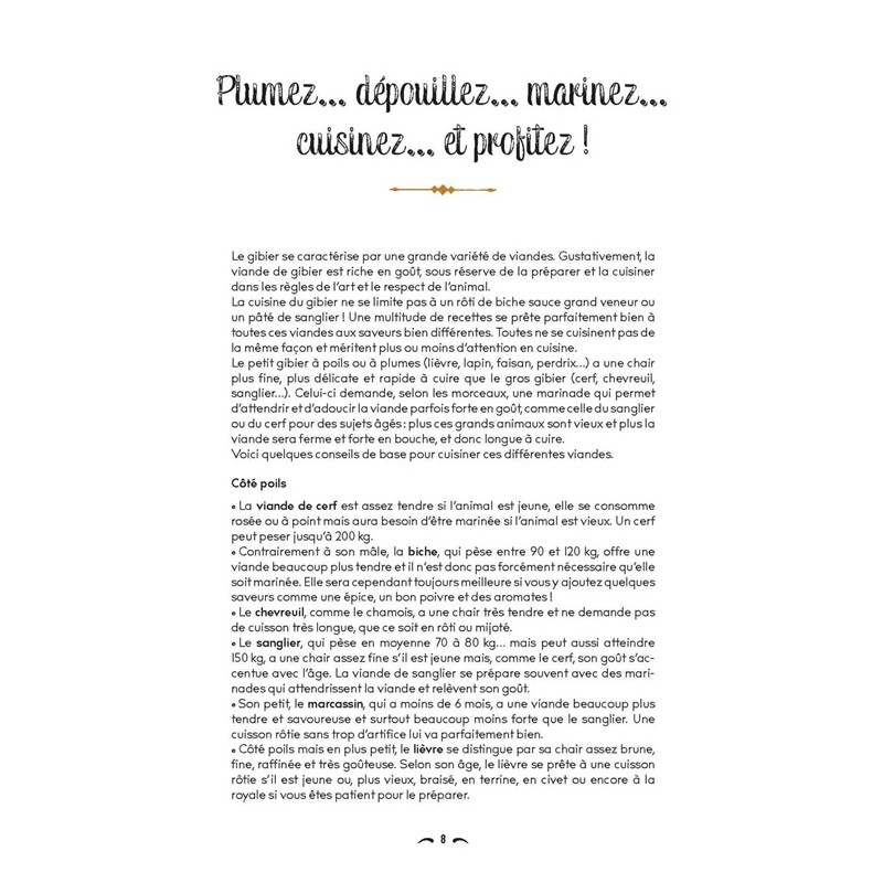 L’ambiance du livre est faite également de photos qui racontent la chasse, la convivialité, les paysages : un voyage au milieu des bois. Ce retour de chasse nous entraine en cuisine pour y concocter un gibier plein de saveurs, d’ici ou d’ailleurs ; un véritable régal des yeux et du palais.