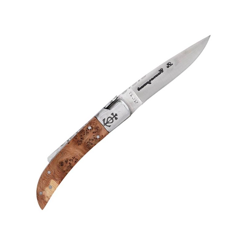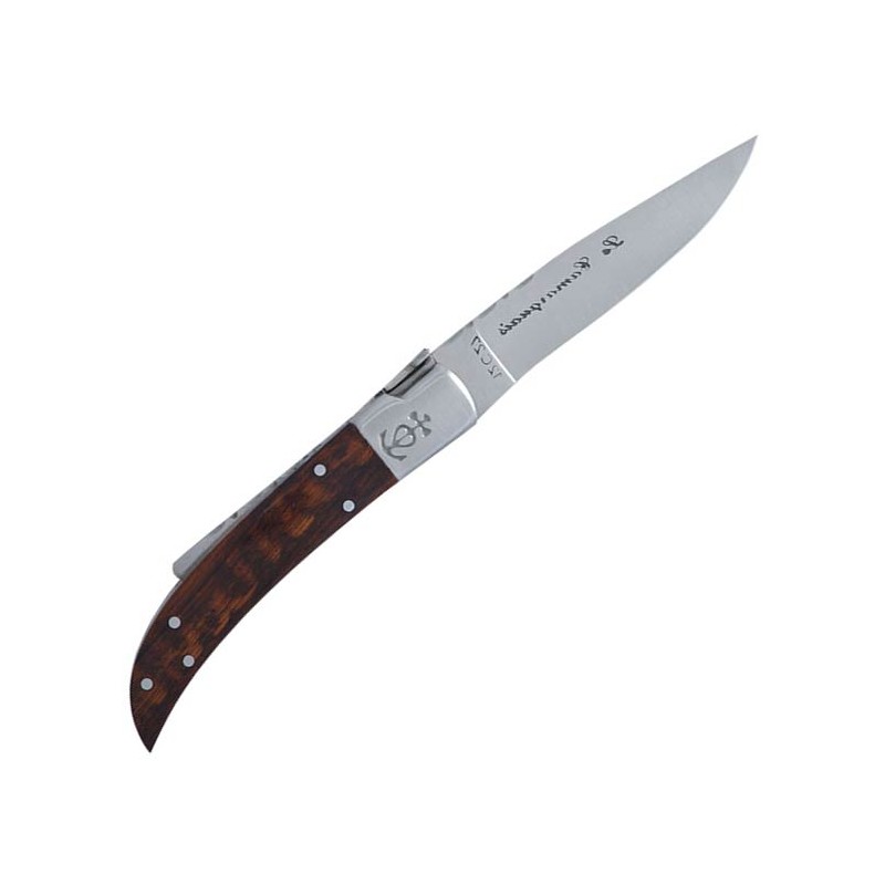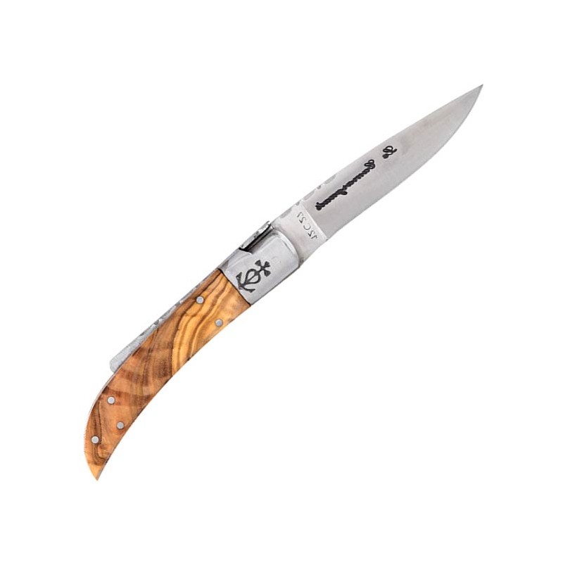 La particularité du Trident forgé confère à ce couteau une identité forte et une robustesse accrue au niveau du mécanisme dorsal. Avec une longueur totale de 195 mm, cet outil de Série 20 se positionne comme un compagnon de poche idéal, capable d'affronter les rigueurs de chaque saison de chasse. Le choix du bois d'olivier n'est pas seulement esthétique ; sa densité naturelle en fait un matériau de manche extrêmement résistant aux chocs et aux variations climatiques. Ce modèle s'adresse à l'amateur de belle mécanique qui exige une pièce capable de traverser les générations tout en restant parfaitement opérationnelle sur le terrain.