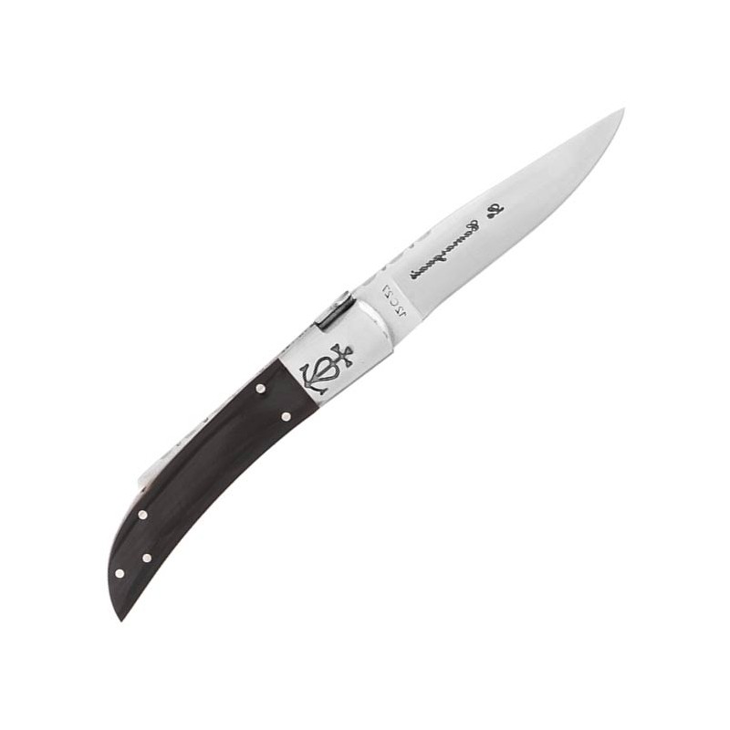 Cette pièce de haute coutellerie est destinée aux chasseurs les plus exigeants, alliant une robustesse mécanique à une esthétique de collection. Ce modèle de Série 20 se distingue par un Trident forgé directement dans la masse du ressort, agrémenté d'un ciselage artisanal qui rend chaque exemplaire unique. La lame de 90 mm, forgée en acier 12C27 (inox), bénéficie d'un polissage miroir d'exception qui facilite l'entretien tout en offrant un aspect prestigieux. Le manche est façonné dans une Pointe de Corne noire véritable, un matériau naturel dense et noble qui assure une prise en main ferme et une durabilité supérieure face aux éléments.
