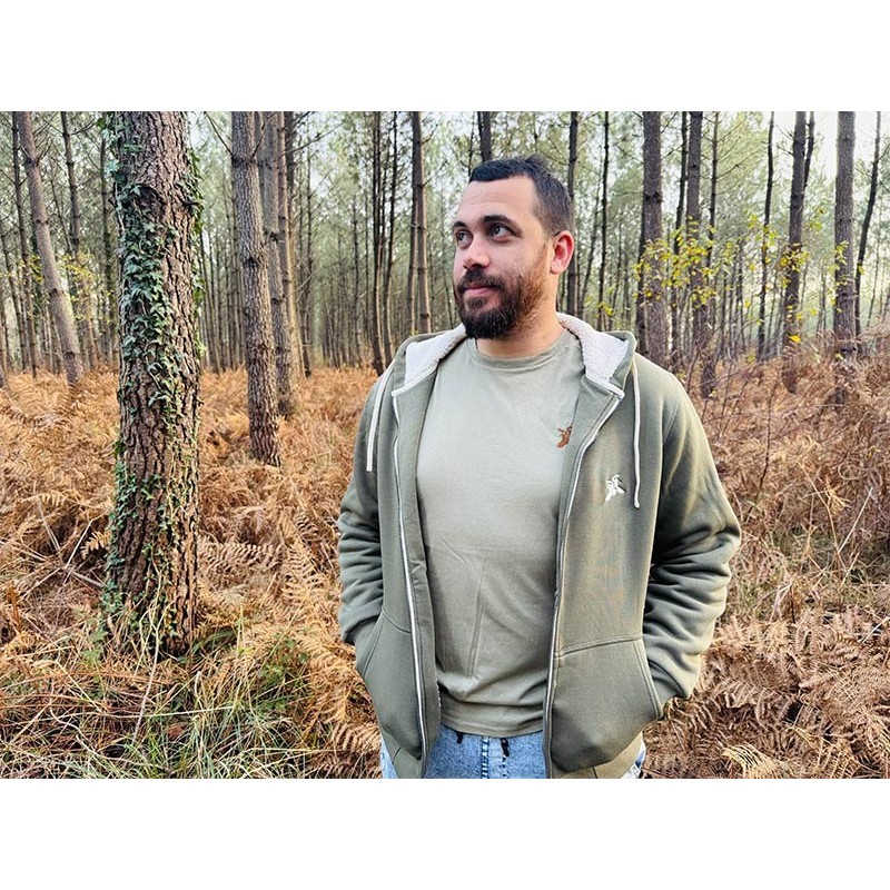 • Ce sweat à capuche moderne,capuche Homme Bas de manches et bas de corps en bord côtes avec élasthanne • 2 Poches latérales • Capuche doublée avec cordon de serrage • Zips et cordon contrastés • Zips décoratifs au dos • Fermetures zippées YKK • Coupe droite • Rembourrage Sherpa 100% polyester recyclé 85% coton bio ring-spun 15% polyester 300 gr /m² • Polyester recyclé issu de bouteilles en PET • Certificat Bio OCS Blended 85%