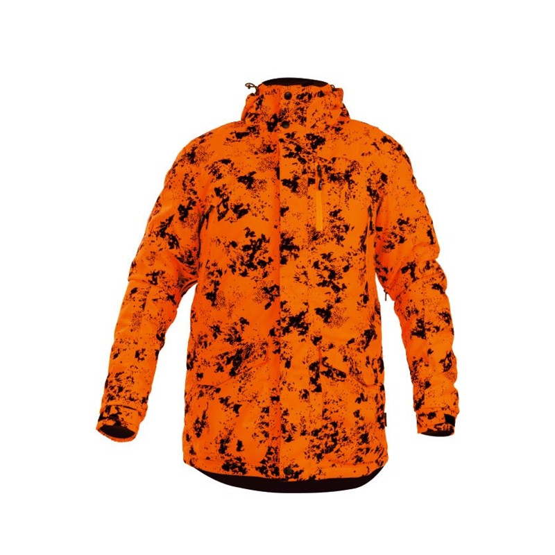 Cette veste silencieuse, isolante et imperméable, au motif camouflage flamboyant, est conçue pour les chasseurs qui ont besoin de sécurité et de camouflage dans des conditions extrêmes.
