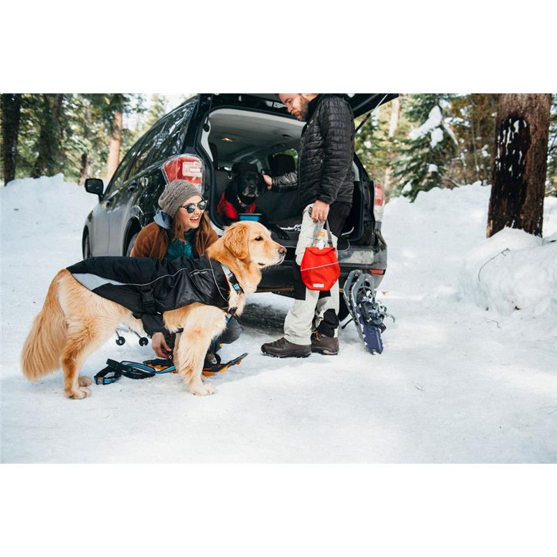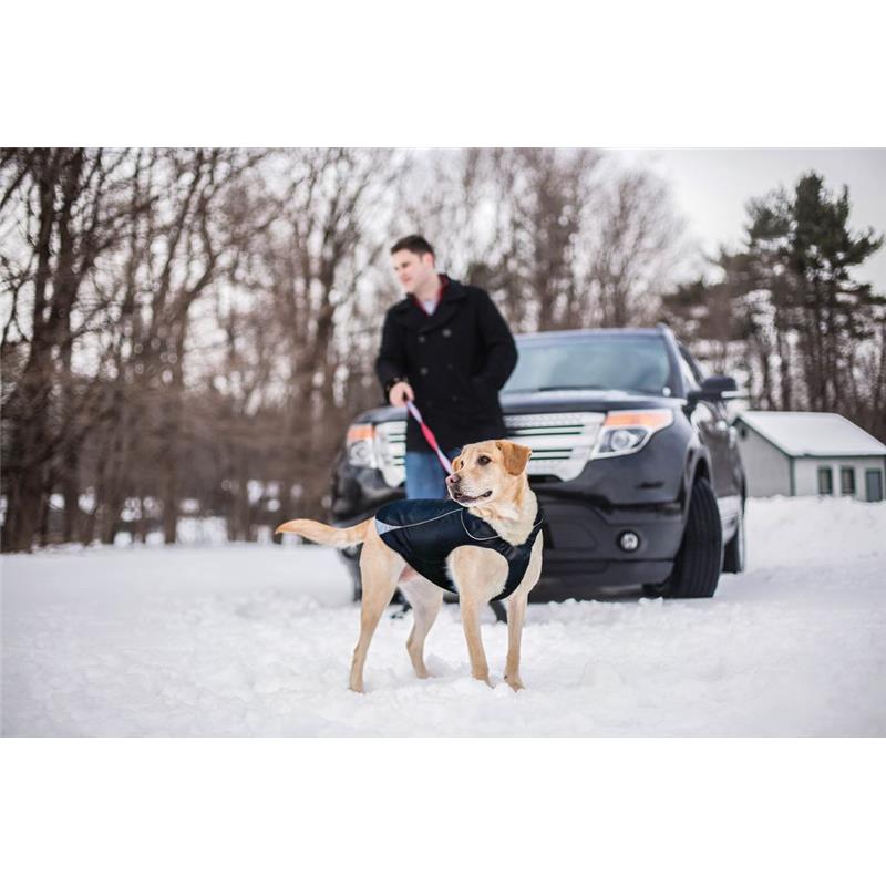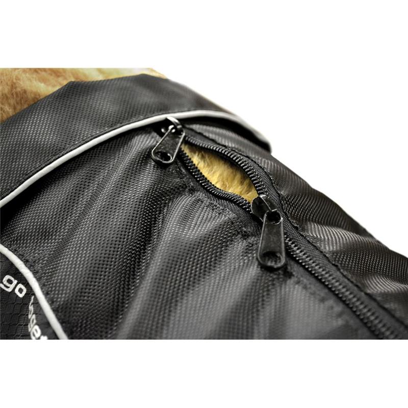 Eine Reißverschlussöffnung ermöglicht das Befestigen der Leine am Halsband oder am Geschirr. Der Schnitt verfügt über Rückenabnäher und zwei seitliche Verstellpunkte für eine bequeme, schlanke Passform. Ein Kragen ist integriert; er kann zum zusätzlichen Schutz hochgestellt oder umgeklappt werden.