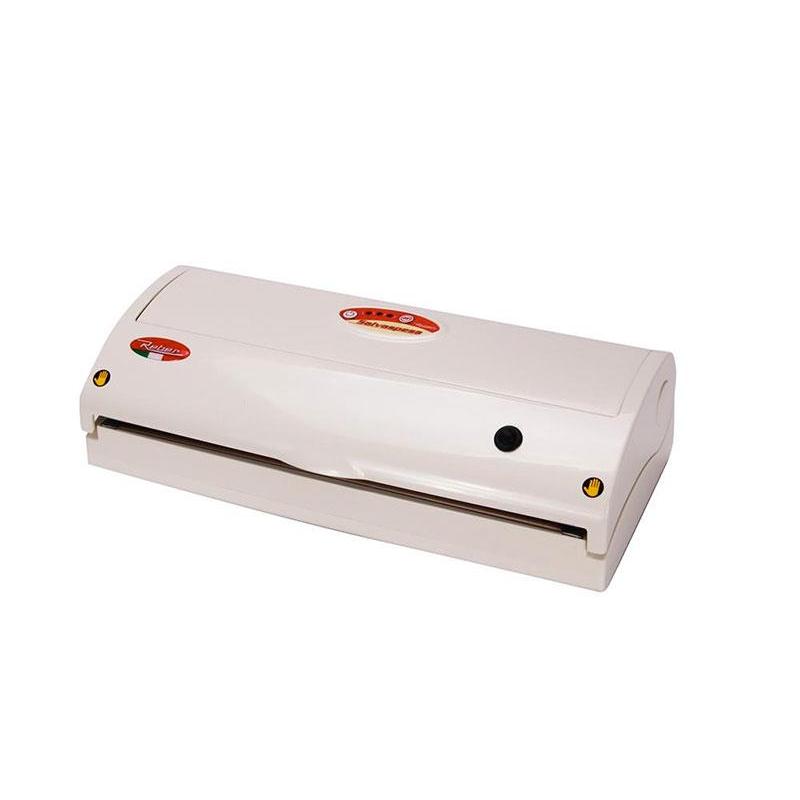 Halbautomatische Vakuummaschine Reber, Schweißstange 32 cm, Saugleistung 16 dm3/min, Vakuum bei -850mbar. Vakuumpumpe, manuelles Entlastungsventil, Anschluss für einen Saugzubehör in den Behältern, halbautomatisches Saugen und Verschweißen, Start durch Drücken der Taste. Die Schweißstange ist unabhängig, Kunststoffgehäuse, geformte Entlastungskammer.