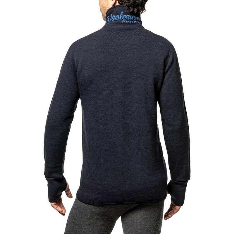 Die Full Zip 400-Jacke hat einen hohen, doppellagigen Kragen sowie Ärmelbündchen mit Daumenlöchern. Der Rücken ist länger, um Lücken zu vermeiden, und der Kragen hat das eingestrickte Woolpower-Logo.