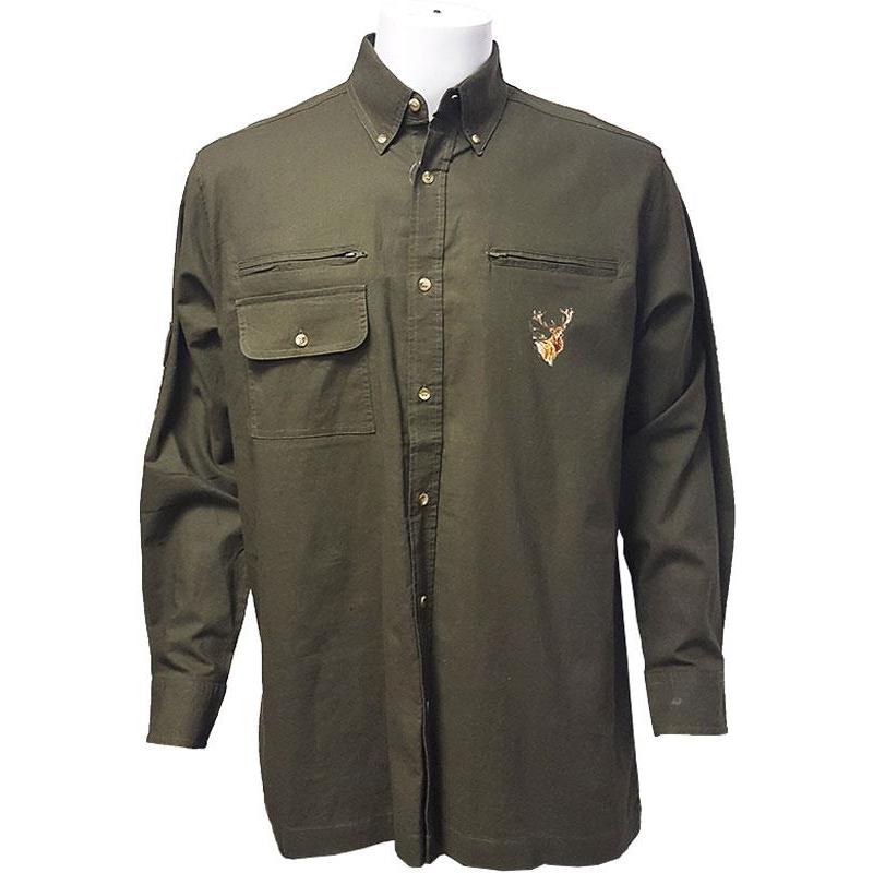 Hemd aus 100 % Baumwolle, 2 Brusttaschen mit Reißverschluss, 1 Brusttasche mit Knopf, 1 Ärmeltasche. Kaki-Farbton. Motive, die die Tasche im Jagdthema verzieren.