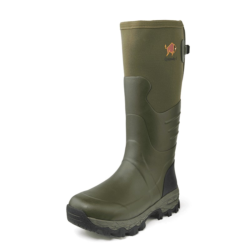 Hier ist der ideale Gummistiefel für Personen mit kräftigen Beinen und breiten Füßen. Er ist mit einem verstellbaren Einsatz für kräftigere Waden ausgestattet. Seine Innensohle, inspiriert von Laufschuhen, sorgt für Komfort und Stabilität. Die profilierte Außensohle ist sehr robust und bietet hervorragenden Halt auf allen Geländetypen.