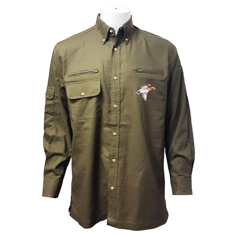 Hemd aus 100 % Baumwolle, 2 mit Reißverschluss versehene Brusttaschen, 1 geknöpfte Brusttasche, 1 Ärmeltasche. Kaki-Grundfarbe. Motive verzieren die Tasche mit Jagdmotiv.