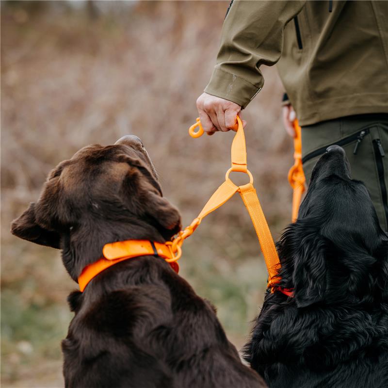 Mit 3 Karabinern ausgestattet ermöglicht er, ihn einfach an Leinen zu befestigen und bis zu 3 Hunde gleichzeitig zu führen.