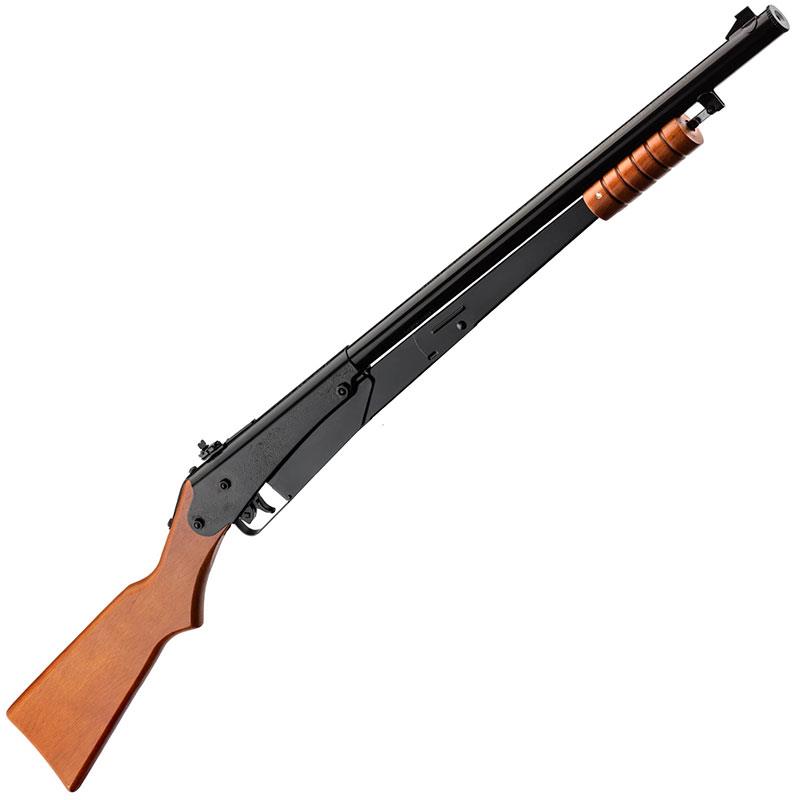 leistung begrenzt auf 1,5 joule für eine geschwindigkeit der stahlkugel von 107 m/s, sie bleibt in der kategorie spielzeug (bis zu 2 joule), es ist jedoch vorzuziehen, sie unter aufsicht eines erwachsenen zu verwenden. glatter lauf aus stahl, kapazität von 50 kugeln im magazin entlang des laufes. projektile : nur bb's aus stahl von 4.5 mm (.177'). spannung durch eine bewegliche pumpe unter dem lauf, manuelle sicherung, schaft aus massivholz gebeizt.