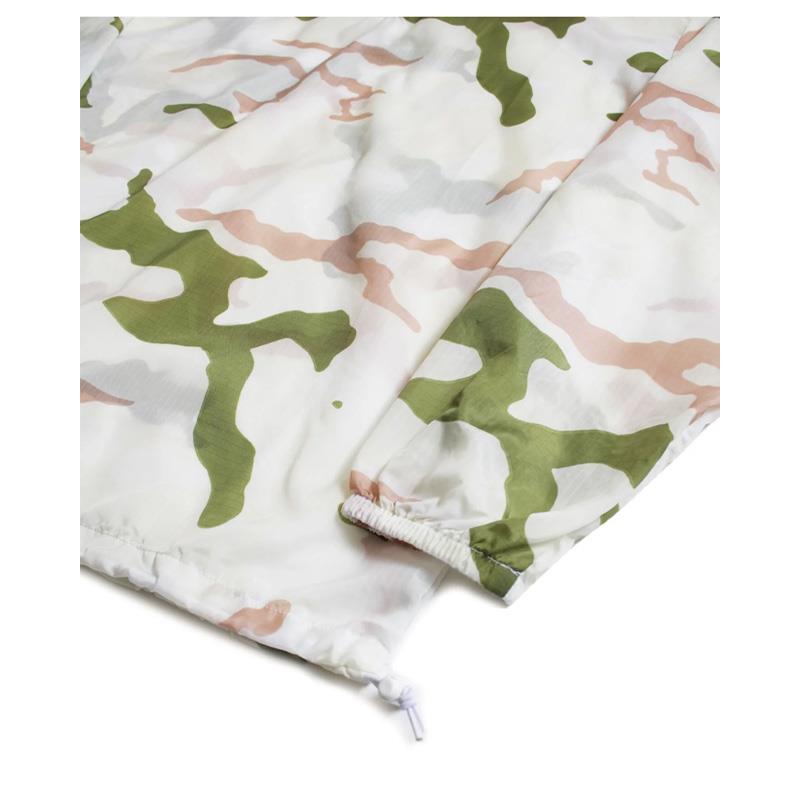 Das verwendete Gewebe ist ein leichtes Nylon-Minirip mit DWR-Finish, wasserdicht und hoch atmungsaktiv. Das gesamte Kleidungsstück wiegt weniger als 200 g (basierend auf Größe M).