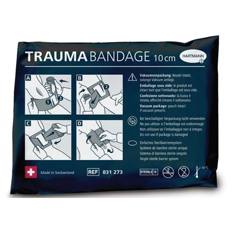 Der individuelle Kompressionsverband der Schweizer Armee 4" (10 cm) ist ein sehr kompakter Verband in Einzelverpackung. Er ist zur Versorgung von stark blutenden Verletzungen am Einsatzort geeignet und insbesondere für Notfälle. Er kann einhändig angelegt werden, er verfügt über eine Schlaufe, mit der das verletzte Glied hineingeführt werden kann (um zu verhindern, dass es frei dreht). Die Schlaufe dient auch als Bissriemen für das einhändige Anlegen am Oberarm bei « self application ». Dank seines Druckapplikators mit 2 Schlitzen bleibt der Verband rotationsstabil am Glied und gleitsicher gegenüber einem Verrutschen in Richtung des distalen Endes. Er ermöglicht Druck und Gegendruck, um über den gesamten Umfang des Gliedes oder des Körpers ausgeglichen zu wirken.