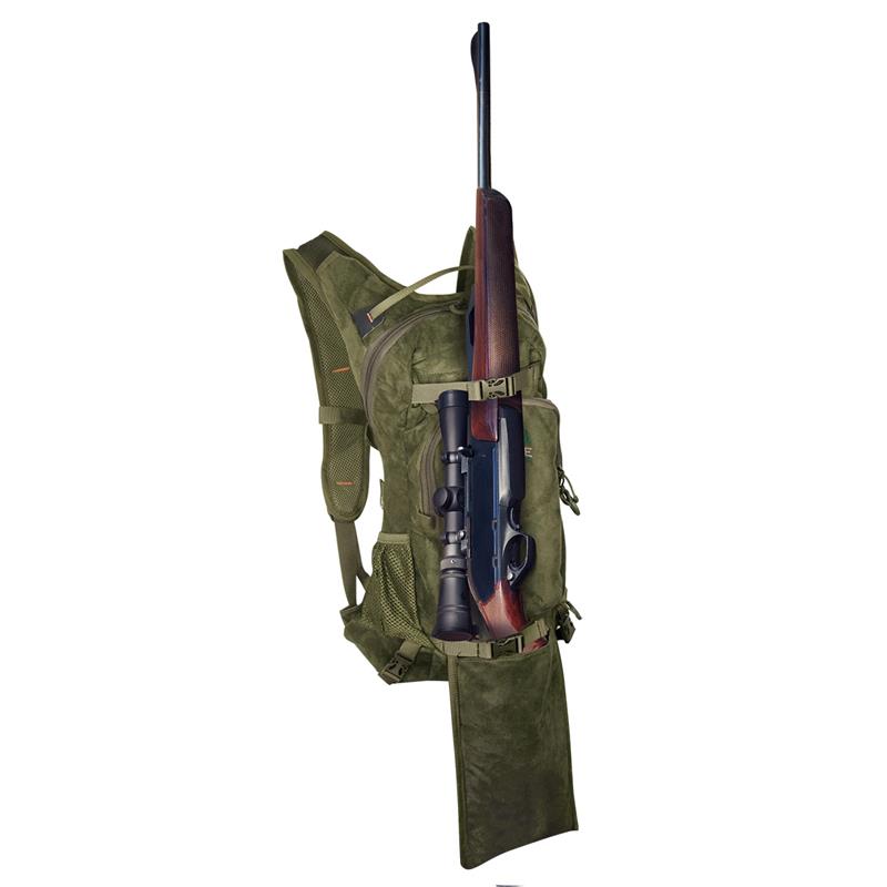 Kleiner, vielseitiger und funktioneller Rucksack, er ist ausgestattet mit dem ovalen Rückensystem, verstellbaren Schultergurten, einem Brustgurt mit Notpfeife und einem Hüftgurt. Die Vorderseite ist mit einer klappbaren Gewehrhalterung mit Verstellriemen versehen, ideal für lange Reisen und um Ihre Waffe bequem und sicher zu transportieren. Außerdem verwandelt sich durch das Schließen der unteren Tasche der Rucksack in ein Aufbewahrungsfach für Ihre Gegenstände. Die Fronttasche verfügt über praktische Netzfächer und außen funktionale Befestigungspunkte. Zwei Gurte an der Basis ermöglichen den Transport von Ausrüstung und seitliche Netzfächer. Kompatibel mit einem Hydrationssystem.