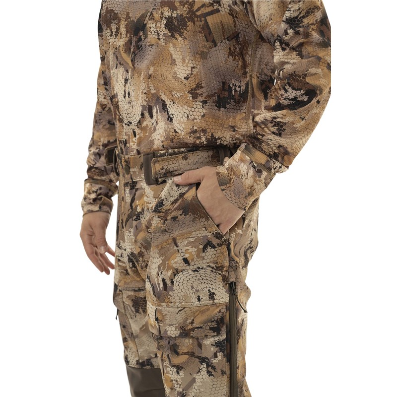 Das Gewebe ist außerdem mit einer DWR-Behandlung (Durable Water Repellent) versehen, die Schutz vor leichten Schauern und morgendlicher Feuchtigkeit bietet, wobei es gleichzeitig atmungsaktiv ist, um Überhitzung an langen Jagdtagen zu vermeiden. Darüber hinaus bieten der ergonomische Schnitt und die erhöhte Elastizität volle Bewegungsfreiheit, passen sich perfekt an alle Körperformen an und gewährleisten optimalen Komfort, selbst bei langen Jagdtagen.