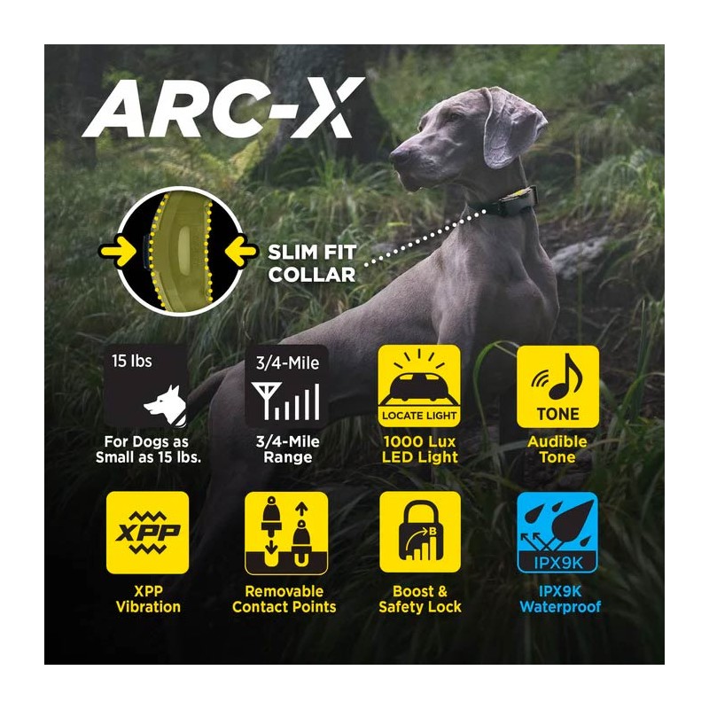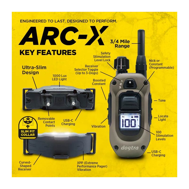 Auf der Empfängerseite ist das Halsband ultrakompakt und vollständig wasserdicht (Norm IPX9K), sodass vollständiges Eintauchen und Reinigung mit Hochdruckstrahl möglich sind. Sender und Empfänger sind mit Lithium-Polymer-Akkus mit Schnellladung in 2 Stunden ausgestattet. Das hintergrundbeleuchtete OLED-Display am Sender zeigt permanent das Stimulationsniveau und den Ladezustand der Batterie an und gewährleistet so die volle Kontrolle auch bei Dunkelheit. Zuverlässig, leistungsstark und intuitiv ist das Kit Dogtra 1200X Black das unverzichtbare Werkzeug für alle, die Exzellenz in der hochwertigen Hundeausbildung suchen.