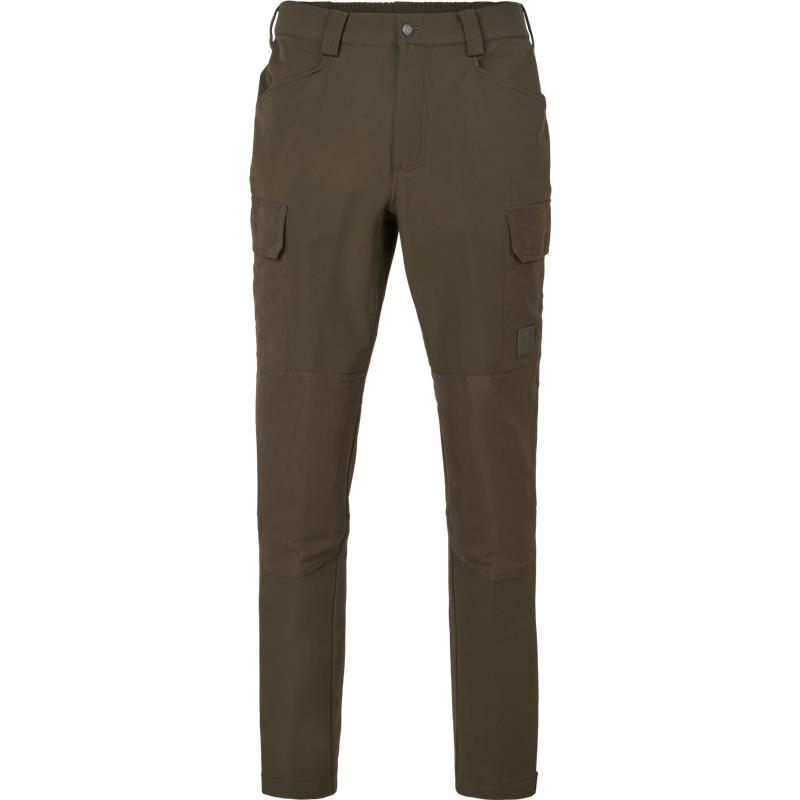 Unsere Hill-Hosen verbinden Geräuscharmut, Langlebigkeit und Komfort. Diese Hose ist aus hochwertigen Materialien gefertigt und verfügt über einen Jeansknopfverschluss in der vorderen Mitte, ergänzt durch einen kontrastierenden Knopf für zusätzliche Sicherheit. Der hinten elastische Bund sorgt für eine perfekte Passform, selbst bei Bewegung. Die Hose verfügt über leicht zugängliche Vordertaschen und Oberschenkeltaschen mit Schutzklappen, die durch geräuschlose Magnetverschlüsse gesichert sind, sodass Sie schnellen Zugriff auf Ihre wichtigsten Gegenstände haben. Die rechte Oberschenkeltasche beherbergt einen Patronenhalter. Der Verstellriemen am unteren Saum ermöglicht die Anpassung der Passform. Ein Logoetikett aus Kunstleder verleiht dieser funktionalen Hose eine stilvolle Note. Mit einem modernen Schnitt und einer DWR-Behandlung ohne PFAS ist die Hill-Hose die perfekte Wahl für aktive Jäger, die im Gelände Komfort und Zuverlässigkeit suchen.