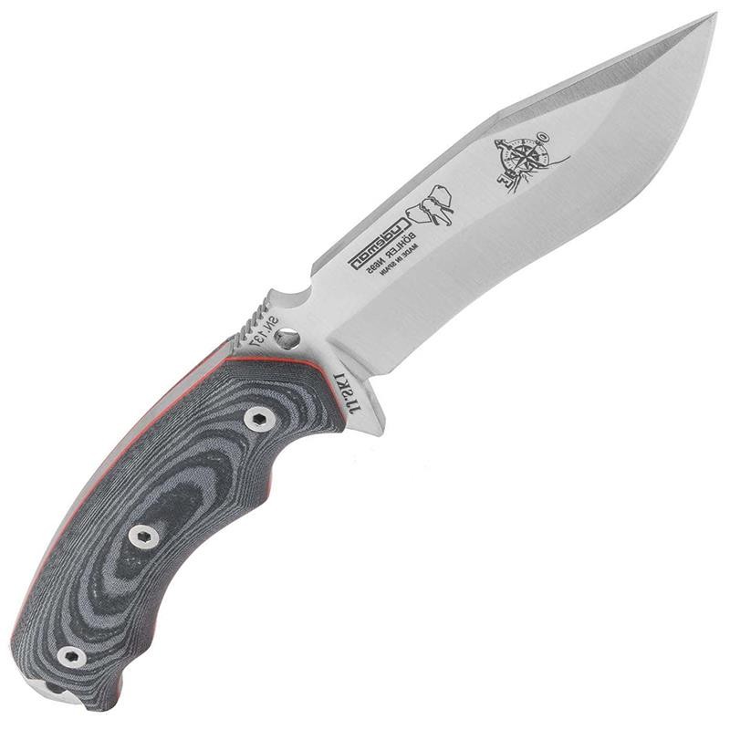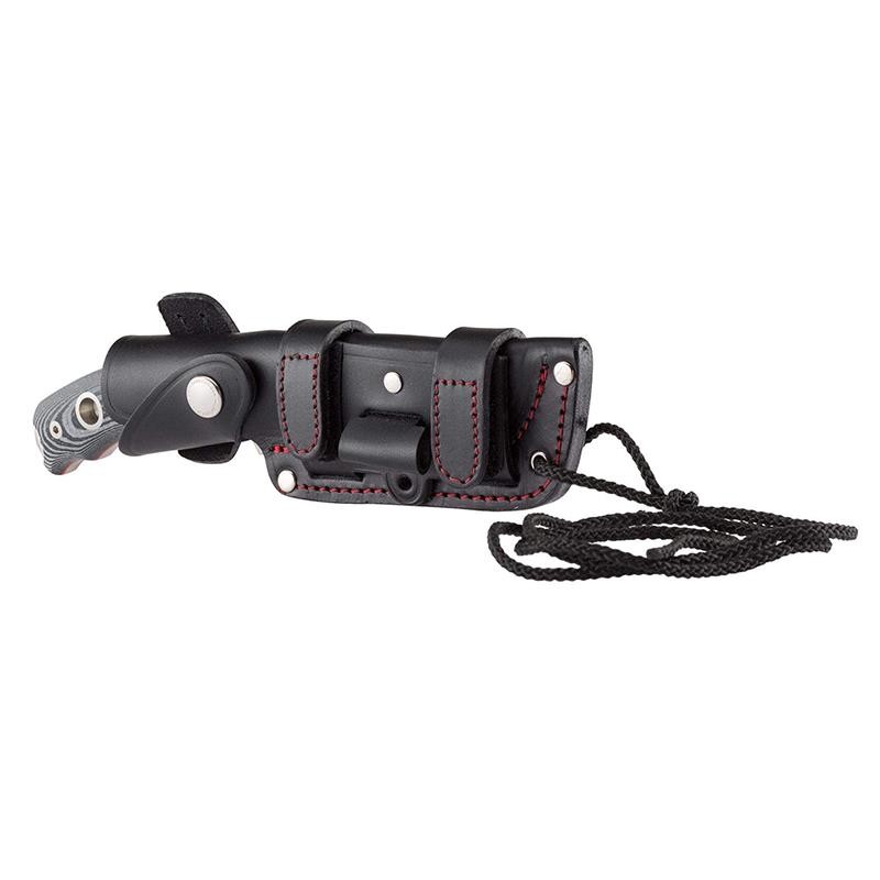 Für intensiven Einsatz in der Natur konzipiert. Dicke und robuste Klinge, konvexe Schneide, Griff aus micarta mit in voller Länge montierter Klinge und geriffeltem Klingenrücken. Knauf mit Glasbrecher und Öse für Handschlaufe. Etui für vertikales oder horizontales Tragen, Oberschenkelriemen
