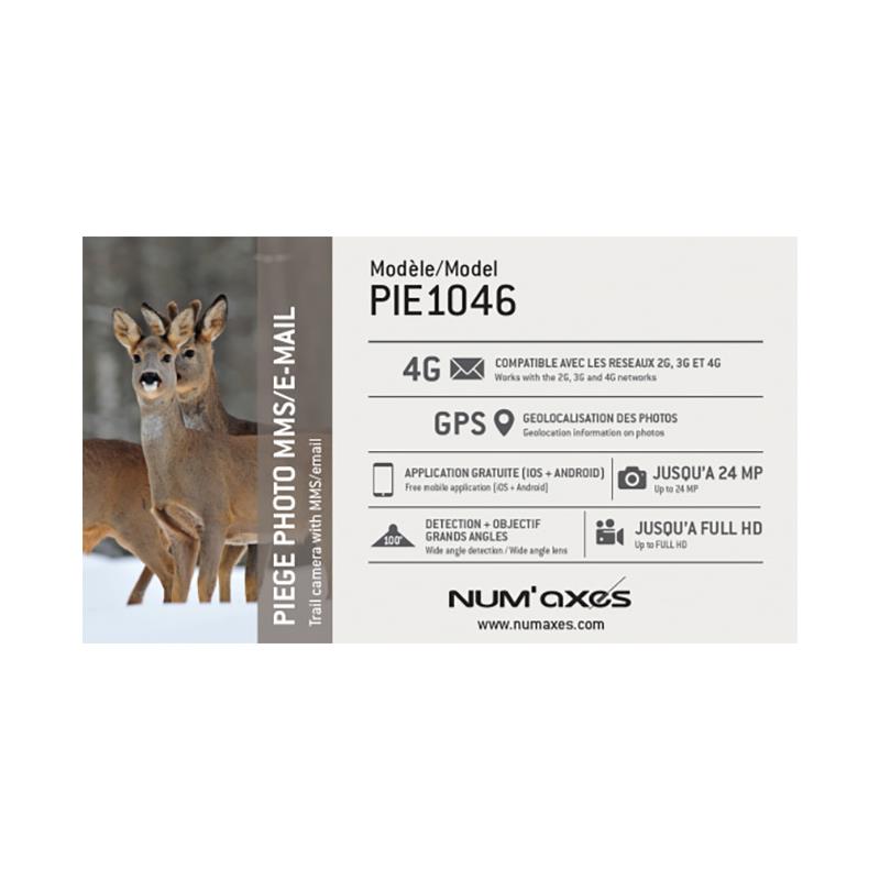 Eigenschaften der Fotofalle PIE1046 • Großer Aufnahmewinkel : 100° • PIR-Sensor (Bewegungsmelder) : - Großer Erfassungswinkel : 100° - Erfassungsdistanz : ca. 20 m - Einstellbare Erfassungsempfindlichkeit : niedrig / mittel / hoch • Infrarot-Flash : - unsichtbare schwarze LEDs - Reichweite : ca. 20 m - Möglichkeit, einen Teil der LEDs zu deaktivieren : verhindert überbelichtete Nachtfotos/-videos nützlich, wenn das Gerät nahe am aufzunehmenden Motiv platziert werden soll - Infrarot-Flash mit automatischer Aktivierung in Abhängigkeit von der Helligkeit - Einstellbarer Nachtmodus : eine längere oder kürzere Belichtungszeit erhöht bzw. verringert die Reichweite des Infrarot-Flashs • Empfänger der Fotos und/oder Videos : - Sie können 1, 2, 3 oder 4 Mobiltelefonnummern eingeben (die Empfänger erhalten nur MMS und somit nur Fotos, keine Videos) - Sie können 1, 2, 3 oder 4 E-Mail-Adressen eingeben (die Empfänger erhalten je nach gewählten Parametern MMS oder E-Mails und somit Fotos und/oder Videos) • Versand der Fotos : - per MMS : Sie können die Fotos nur in kleiner Größe senden (640x480) - per E-Mail (FTP oder SMTP) : Sie können die Größe der per E-Mail gesendeten Fotos wählen : kleine Größe (640x480) große Größe (1920x1440) Originalgröße (8 MP, 12 MP oder 24 MP je nach gewählter Fotoauflösung) • Versand der Videos : - nur per E-Mail (FTP oder SMTP) und nur wenn am Ort der Installation der Fotofalle 4G verfügbar ist. • Möglichkeit de das Gerät aus der Ferne zu konfigurieren und auszulösen dank einer kostenlosen Mobile-App (Android/iOS) - Name der Anwendung : NumCam • Beim Einlegen der SIM-Karte (Standardgröße), erkennt das Gerät automatisch den Mobilfunkanbieter und trägt die entsprechenden MMS-/E-Mail-Versandeinstellungen ein (nur wenn der Anbieter in der Liste der im Gerät vorprogrammierten Anbieter enthalten ist). • Mitgelieferte externe Antenne : - sorgt für besseren Empfang in Gebieten mit schwachem Netz - Höhe der Antenne : 22 cm - Kabellänge : 2 m - magnetische Basis • Aufnahmemodi : - Foto : 1 bis 5 Fotos pro Auslösung - Video mit Ton : programmierbare Dauer von 5 bis 59 Sekunden - Foto + Video mit Ton : bei jeder Auslösung wird zuerst ein Foto und dann ein Video aufgenommen • Fotoauflösung : 8 MP / 12 MP / 24 MP • Foto-Dateiformat : JPEG • Videoauflösung : WVGA / HD 720P / Full HD 1080P • Video-Dateiformat : MOV • PIR-Erkennungsmodus : das Gerät nimmt Fotos oder Videos auf, wenn der passive Infrarotsensor (PIR) Aktivität in dem von ihm überwachten Bereich erkennt • Time-Lapse-Modus : Fotos oder Videos werden automatisch in regelmäßigen Zeitabständen während eines vom Benutzer definierten Zeitfensters aufgenommen • Hybridmodus : PIR-Erkennung + Time-Lapse-Betrieb gleichzeitig • Kennzeichnung auf den Fotos : Uhrzeit, Datum, Temperatur, Mondphase, Geräte-Identifikationsnummer, Batterieladezustand, GPS-Koordinaten des Fotos • Speicher : SD- oder microSD-Karte mit Adapter von 4 GB bis 32 GB, Klasse 10 mindestens (nicht enthalten). Das Gerät funktioniert auch mit einer 64-GB-microSD-Karte mit Adapter der Marke NUM'AXES. 64-GB-Speicherkarten anderer Marken könnten nicht funktionieren. Sie können microSD-Karten mit Adapter jederzeit auf dieser Website erwerben (8 GB, 16 GB, 32 GB oder 64 GB). • Loop-Aufnahme auf der Speicherkarte : - Vom Benutzer programmierbar : ON/OFF - Wenn die Speicherkarte voll ist, nimmt die Kamera neue Fotos/Videos auf und löscht dabei die ältesten Fotos/Videos. • Programmierbare Geräte-Identifikationsnummer : ermöglicht die Identifizierung, wo und mit welchem Gerät ein Foto aufgenommen wurde, was sehr nützlich sein kann, wenn Sie mehrere Geräte haben. • Programmierbares Passwort