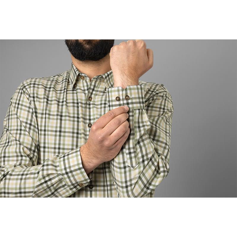Das Milford-Hemd ist aus einem 100 % Baumwollstoff geschnitten. Sie hat eine Brusttasche, die auf der linken Seite mit einem Knopf verschlossen ist, einen amerikanischen Kragen sowie zwei Knöpfe an jeder Manschette. Sein knitterfreier Stoff muss nicht gebügelt werden.