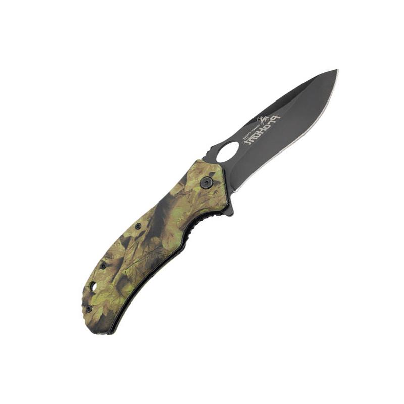 Klappmesser mit orangefarbenem Camo-Aufdruck am ergonomischen Griff. Verstärkter Griff. Feuerstarter im Griff integriert. Klinge 9 cm. 420er Kohlenstoff-/Chromstahl. Sicherung. Schnelle Öffnung. Im Blister geliefert. Ghost camo B&B - Ghost camo Forest