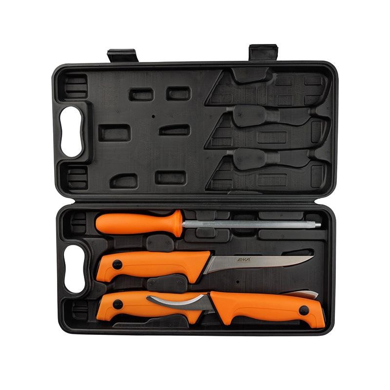 Wird in einem eleganten und sehr praktischen Transportetui geliefert. Das EKA-Metzger-Set ist ebenfalls sehr beliebt. Es umfasst einen Wetzstahl, ein Häutungsmesser, ein Ausbeinmesser und einen Bauöffner. Natürlich erhalten Sie es in einem Etui, das die Klinge schützt. Ein echtes EKA-Metzger-Set trägt die Buchstaben EKA, die in dem schwarzen Kreis des Griffes geformt sind, derselbe Kreis, den Sie sehen, wenn Sie einige der neuesten Modelle unserer « Butcher Pro Series » bestellen.