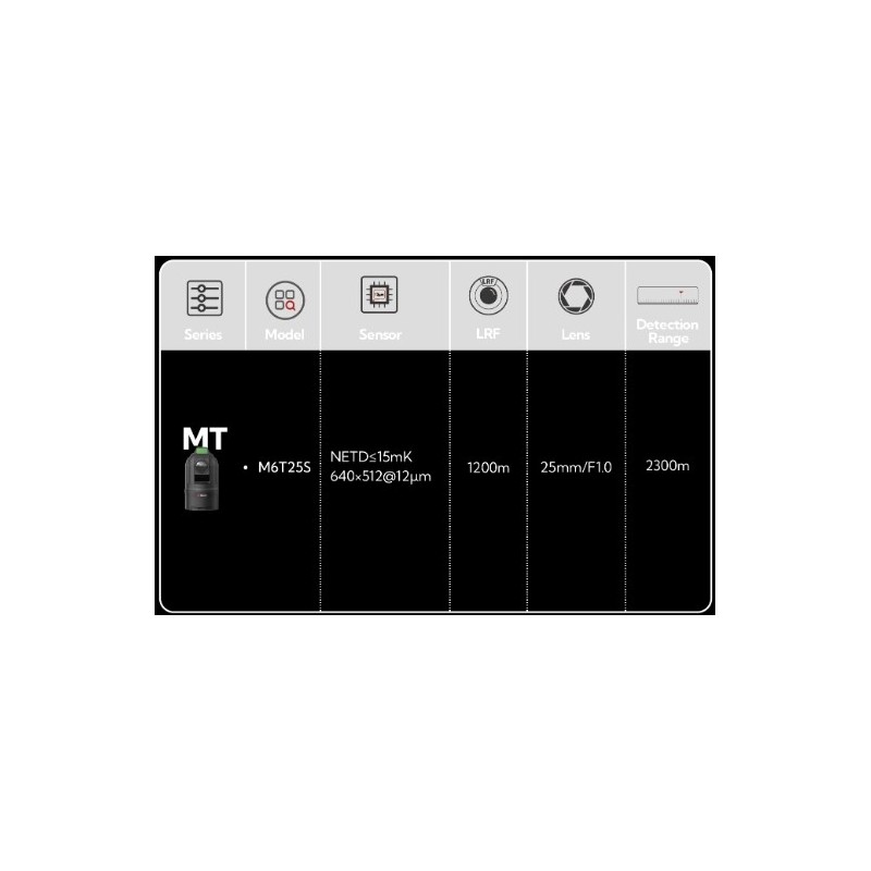 Technische Daten : • Modell M6T25S • Wärmebildsensor 640×512 und 12 µm • NETD, mK ≤15 • Bildfrequenz, Hz 50 • Objektiv, mm 25 F1.0 • Sichtfeld (H×V), ° 17,5 x 14 • Detektion/Erkennung/Identifizierung, m 2300/590/290 • Vergrößerung, × x1, x2, x4 • Azimutbereich : kontinuierliche Rotation bei 360° • Höhenbereich, ° -90~+90 • Bürstenloser Motor/geräuscharm/stabile Leistung • Anzahl vordefinierter Punkte Bis zu 8 • Automatische Fahrt • Spur : Navigation in der Reihenfolge der vordefinierten Punkte • Akku-Pack : wiederaufladbar und austauschbar, 7hx2 • Reservierte Stromversorgung 12V DC über Kabel • Laser-Sicherheitsklasse Klasse 1 • Maximale Reichweite des Entfernungsmessers, m 1200 • Festmontage Mit Montagehalterung • Schutzart IP IP56 • Betriebstemperatur, ℃ -20~+60 • Gewicht, g 889 • Abmessungen, mm Φ80,2×146,6