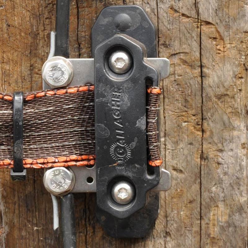 Anschlussplatte für Eckisolatoren des TurboLine-Bandes. Sie dient auch als Verankerungsisolator (die Schlaufe kann zu diesem Zweck um 90 Grad umgeklappt werden).