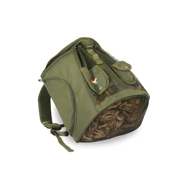 Rucksack zum Pilzesammeln, gefertigt aus Gewebe und teilweise aus Netz. Entspricht der geltenden Gesetzgebung. Gepolsterter Rücken mit 4 Fächern, verstellbarer Brustgurt, Schulterriemen und Hüftgurt. Ausgestattet mit zwei seitlichen Faltentaschen, davon eine aluminium-isolierte Tasche zum Verstauen einer Trinkflasche, um deren Inhalt kühl zu halten. Fronttasche für den Ausweis, Messertasche und praktische Faltentasche am Deckel. Verstellbarer und zusammenklappbarer Schulterriemen, um das Sammeln von Pilzen zu erleichtern.