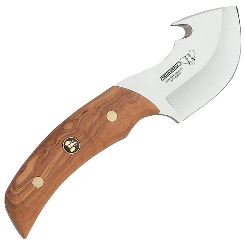 Abziehmesser mit Griff aus Olivenholz, Typ Skinner, mit Ausnehmhaken am Ende der Klinge. Ideal zum Häuten und Ausnehmen von großem Wild: Wildschwein, Reh, Hirsch... Das Abziehmesser für die Jagd mit Olivenholzgriff von Cudeman ist zum Abziehen von großem Wild konzipiert. Dieses Abziehmesser mit kurzer, gebogener Klinge ist ein handliches, sehr scharfes Messer mit einem Haken am Klingenende, mit dem sich die Haut des Tieres leichter entfernen lässt; aus geschmiedetem Stahl gefertigt, ist es besonders zuverlässig und robust.
