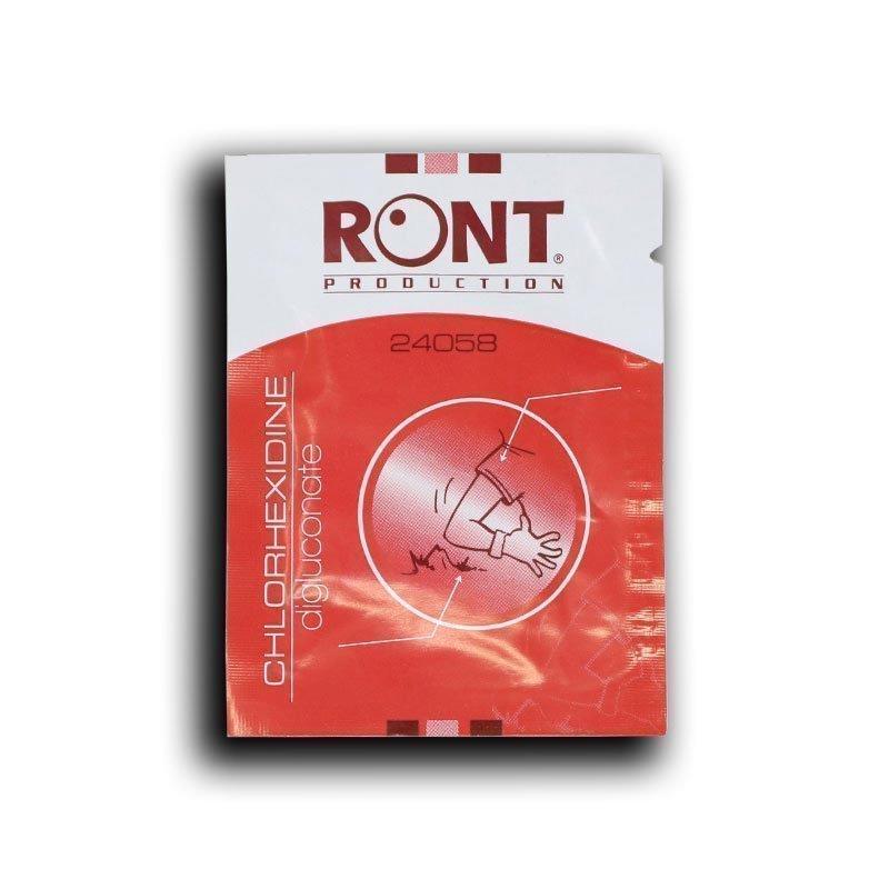 Dieses mit Chlorhexidin getränkte Tuch der Marke Ront ermöglicht die Reinigung und alkoholfreie Desinfektion einer Wunde. Die Lösung brennt nicht, sie ist geruchlos und farblos.