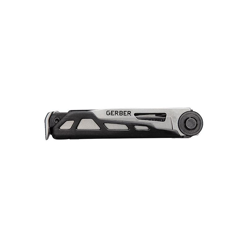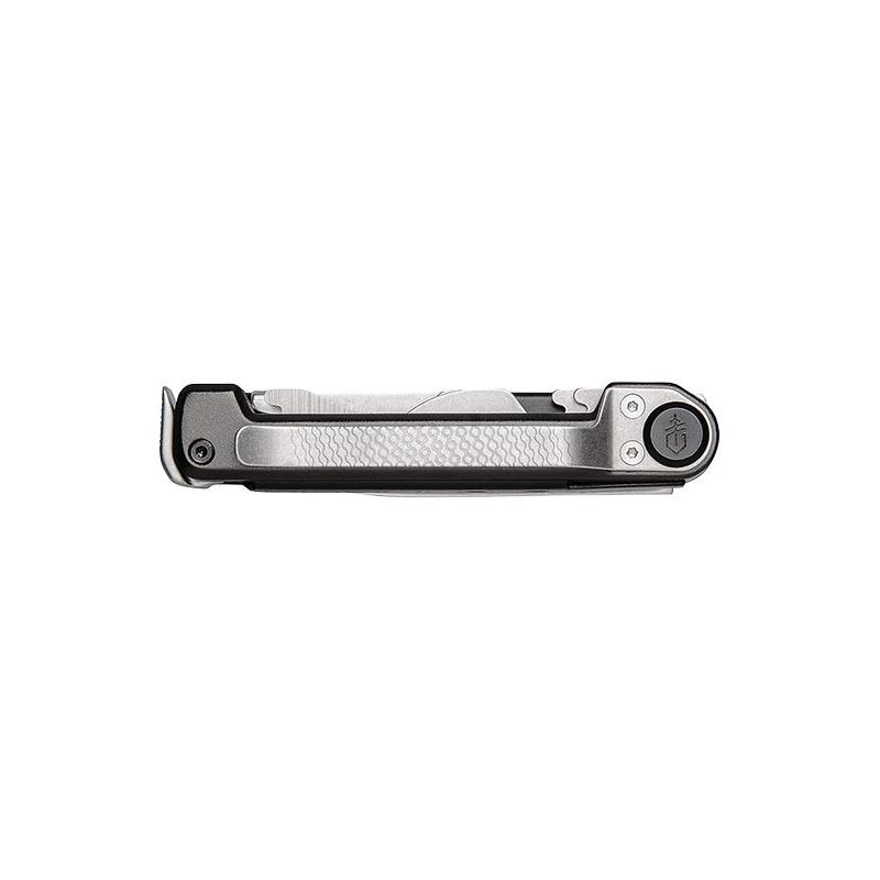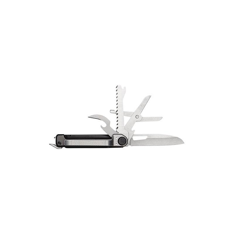 Werkzeug mit 7 Funktionen, ausgestattet mit einer glatten Klinge, einem Flaschenöffner, einem Hebel, einem Hammer, einer Schere, einem Dosenöffner und einer Säge