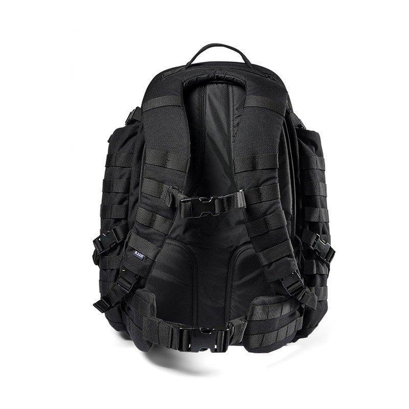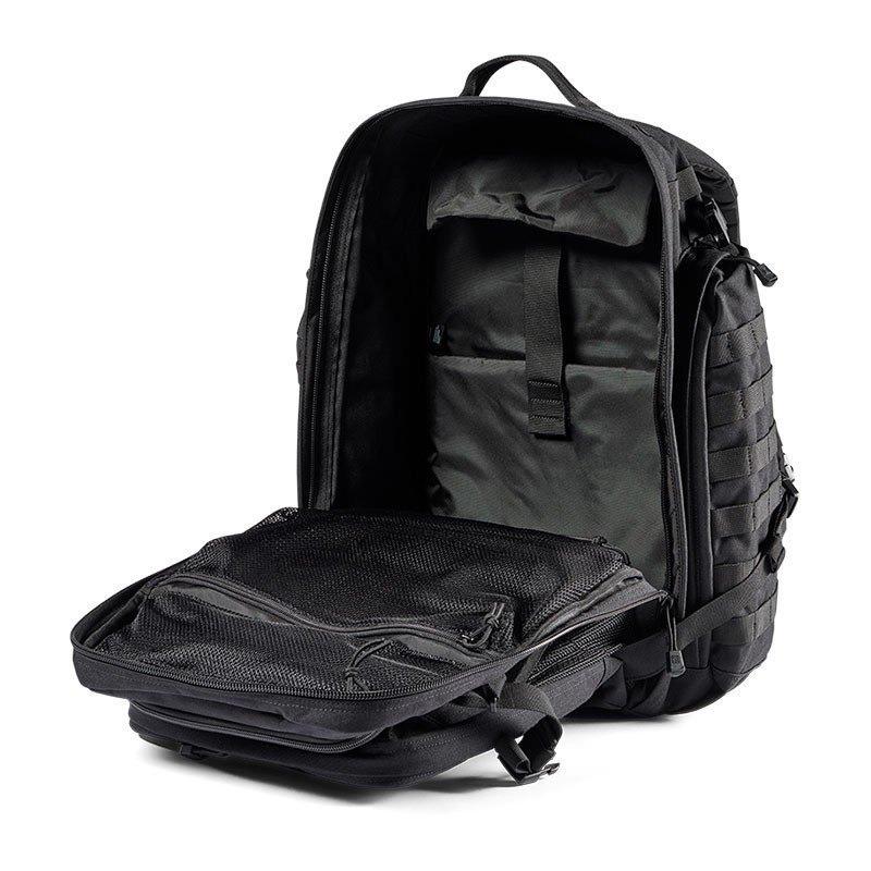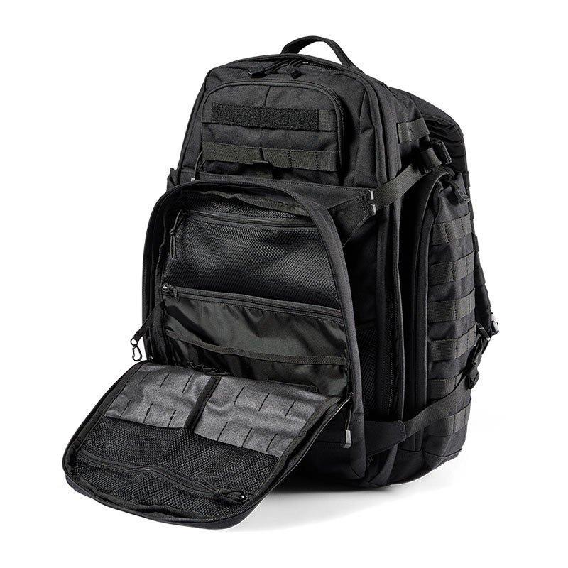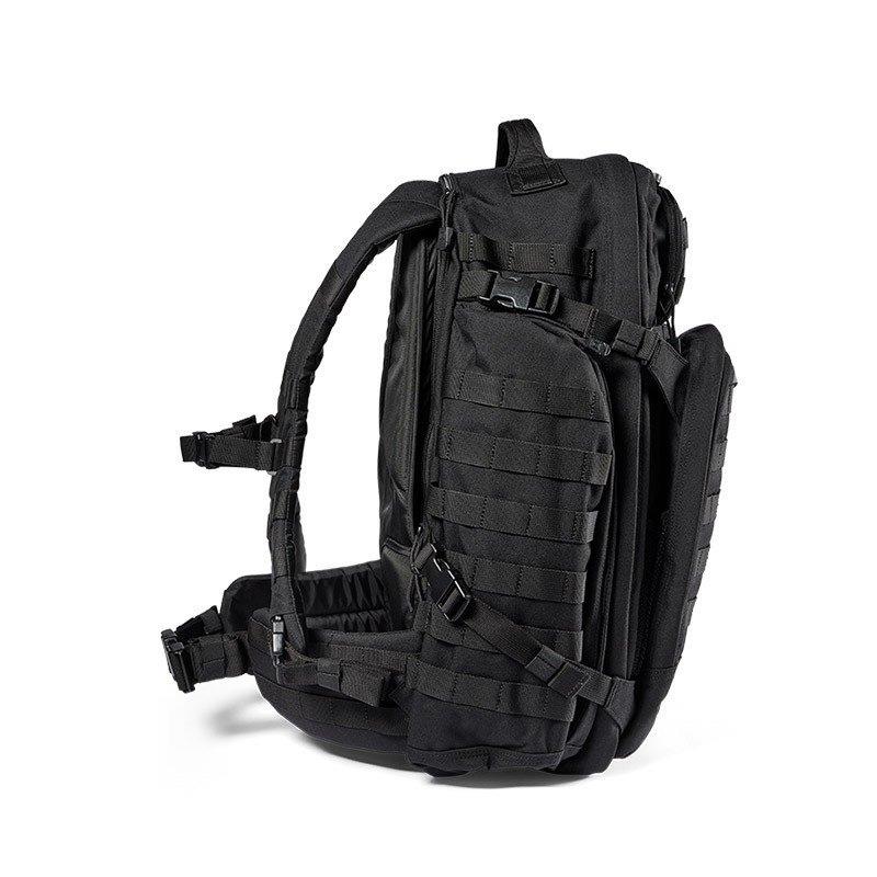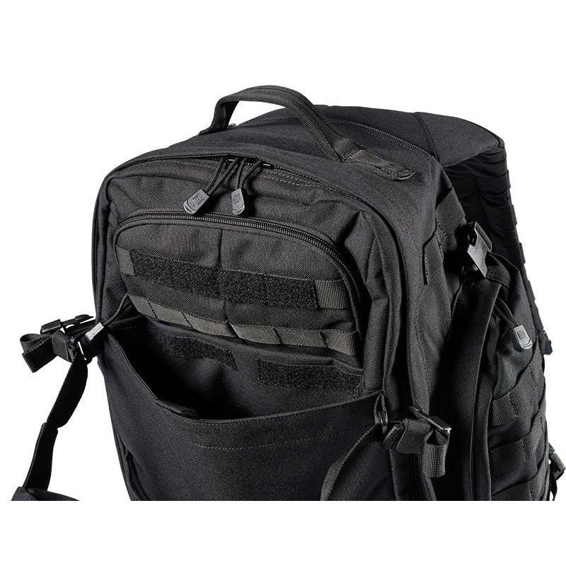 Features: • Large tactical backpack with numerous pockets and compartments • External toss-it-all for helmet or equipment (Shove-It) • Padded internal pocket for laptop • Back-Up Belt system™ compartment • Very spacious main compartment with zippered mesh pockets • Main opening up to 180° • Practical front administration compartment with document pocket • Hook for keys • Space for hydration reservoir • 2 side zip pockets • Many MOLLE loops • High external zip pocket • Micro-fleece spectacle zip pocket • 4 external compression straps • Adjustable padded, ergonomic and contoured straps • Light PE frame with ergonomic aluminum support bar for the support of the bag and stability (removable) • Release clip on each strap • Chest strap adjustable in height • Abdominal belt • 4 attachment points under the bag for additional equipment • Top carry handle • Drainage holes for debris and water • Holes for routing of hoses or communication cable • Patch location and surname strip • Signature 5.11 Center Line™ design • Compatible with the Rush™ Tier system for attaching MOAB 6 and MOAB 10