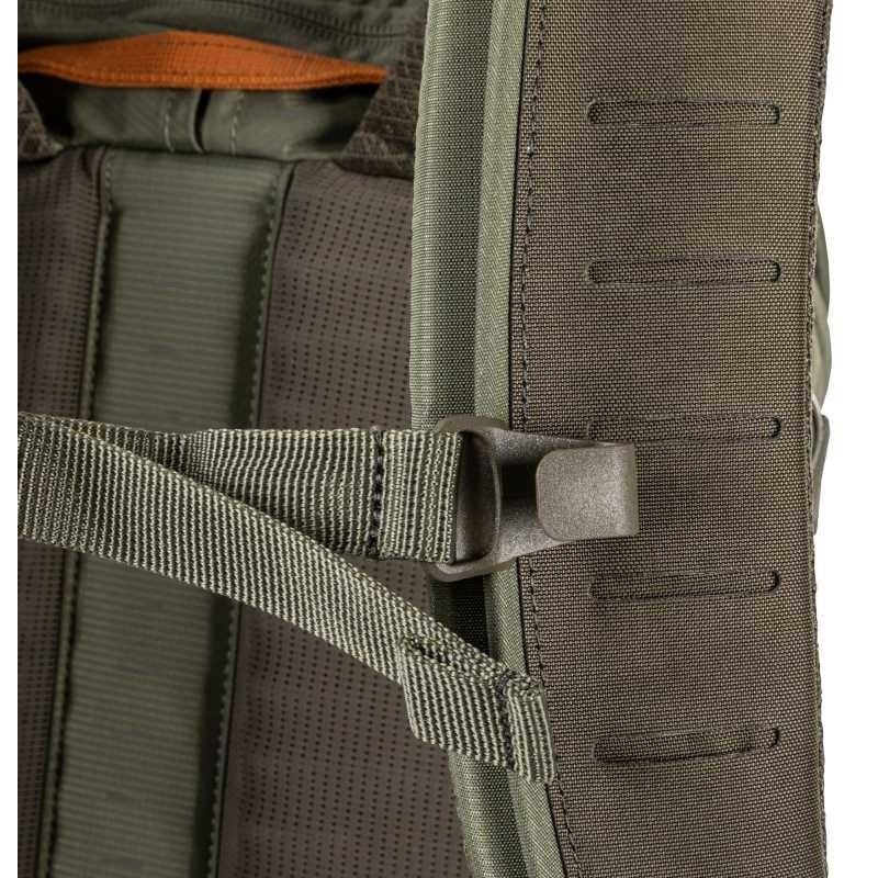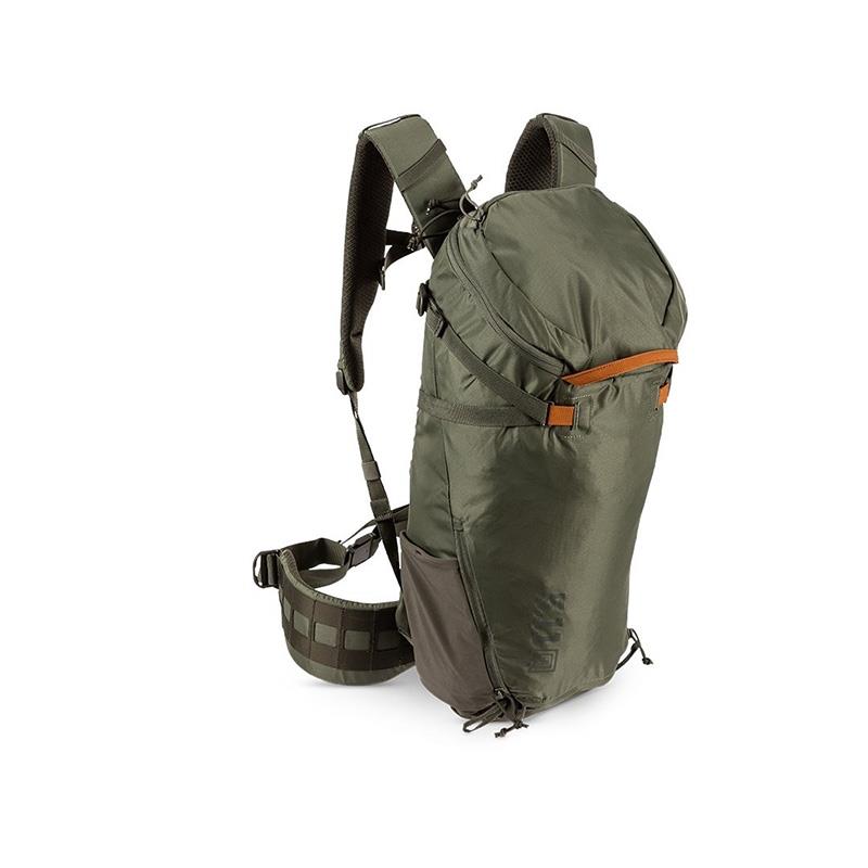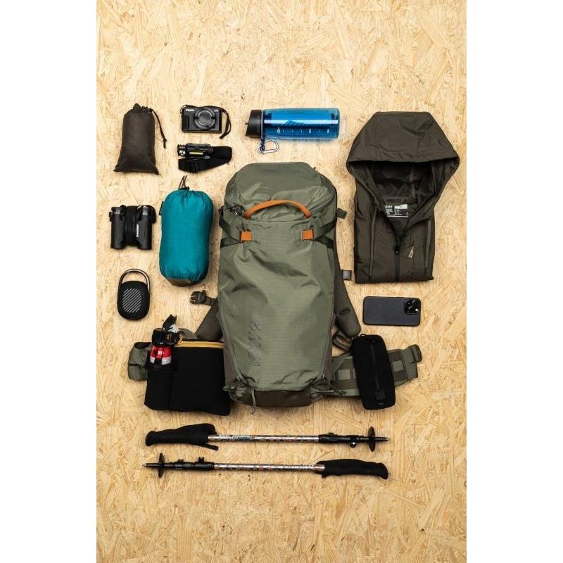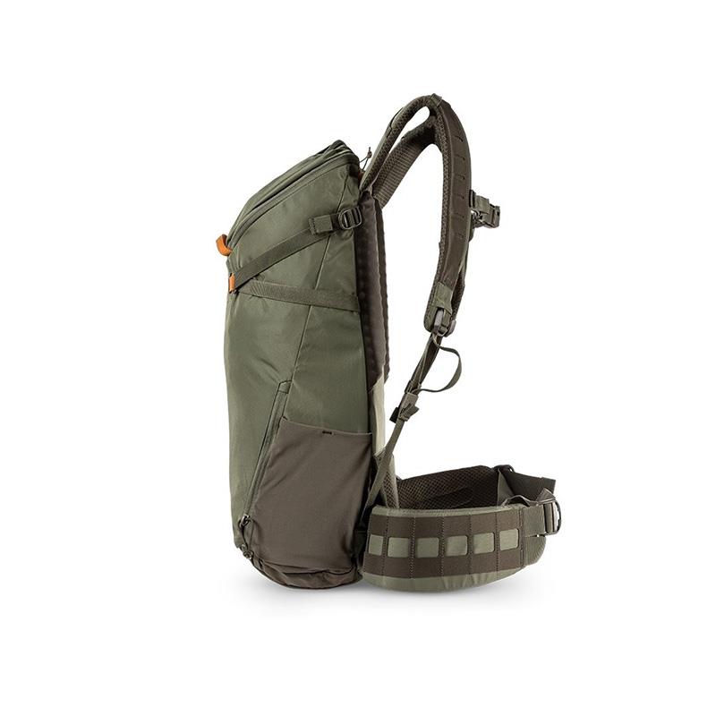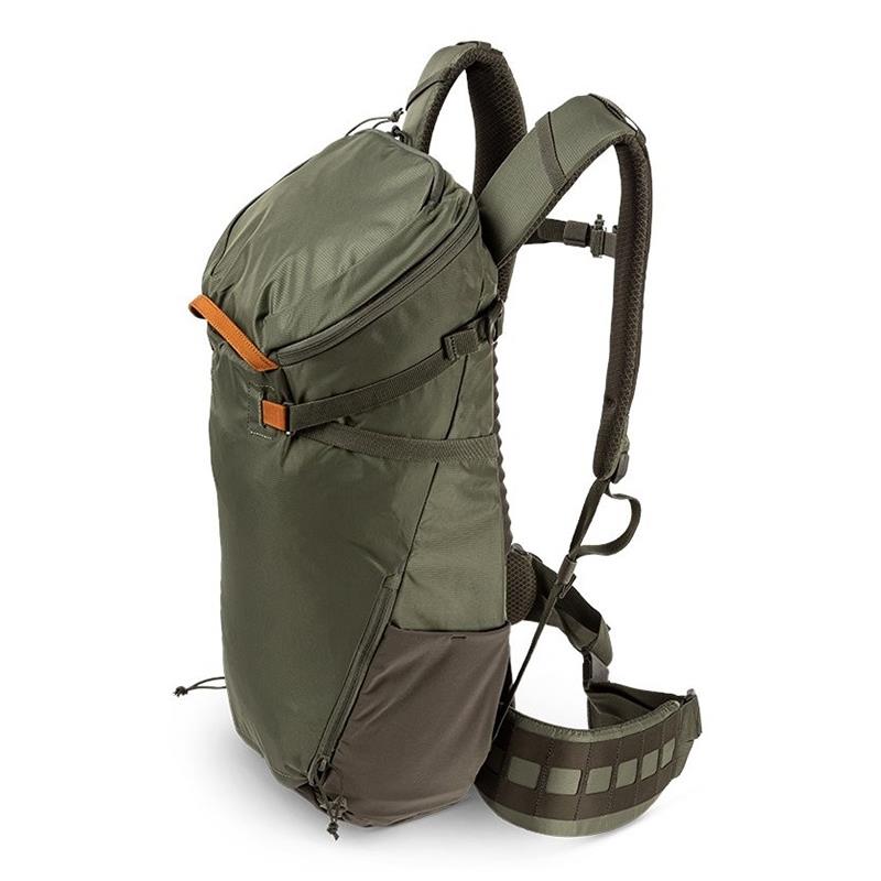 Features: • Versatile backpack • Main compartment top opening with bucket lid • Two expandable exterior pockets for water bottles • Upper external pocket for accessories or first catches • Internal hydration sleeve with a securing strap and a zipped top pocket • Gear passages with side compression straps • Lumbar pad with a removable hip belt, laminated laser-cut MOLLE and quick-release buckle • Concealed rain cover in high-visibility orange for safety • Padded shoulder harness with an adjustable sternum strap and a laser-cut MOLLE platform • Padded back panel with air circulation channel • Lower zippers for access to secondary main compartment • Front and rear carry handles • 330D Ripstop Nylon fabric (main body) | 200D PU coated polyester (rainfly rain cover)