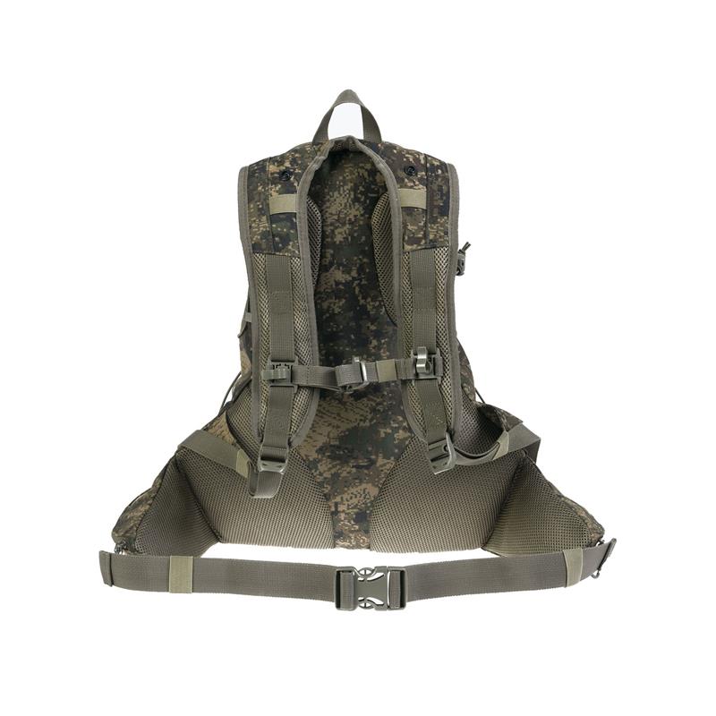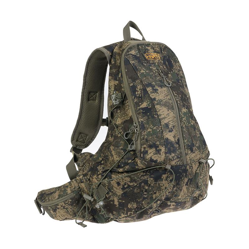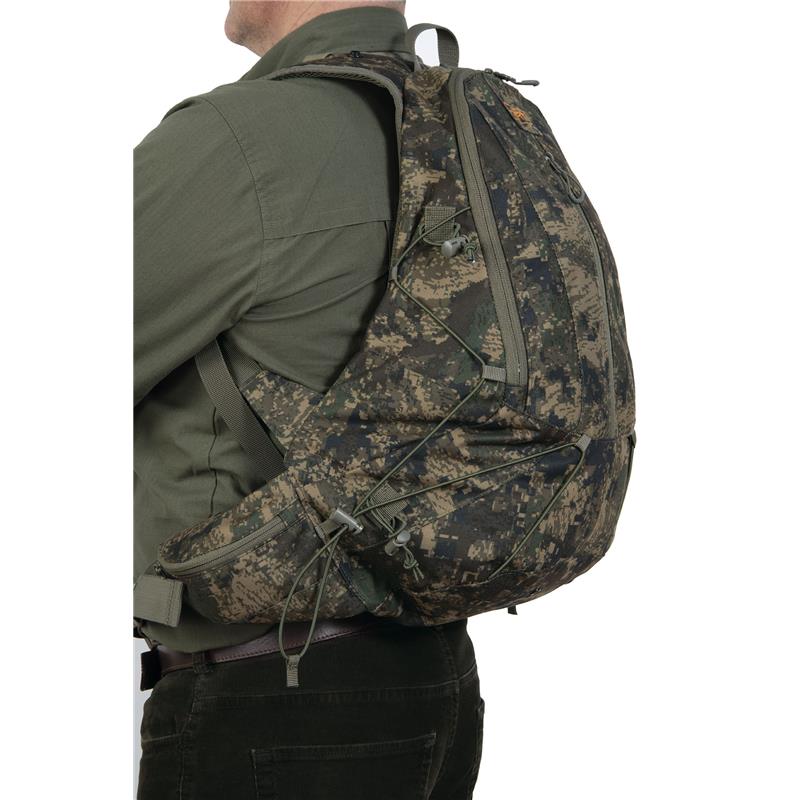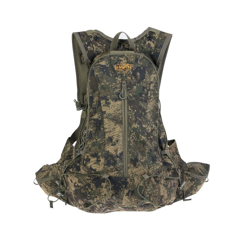 Waterproof, lightweight, sturdy and super quiet fabric. Perfect for woodcock, partridge, and quail hunting with a dog or any other outdoor activity such as brisk walking. Compact capacity with a large opening and a compartment for a liquid pouch. Its enveloping shape provides stability. Zippered front pocket and two zippered side compartments. Elastic straps for additional load. Padded back in breathable foam. Adjustable straps and harnesses. Removable rain cover in the zippered pocket at the base.