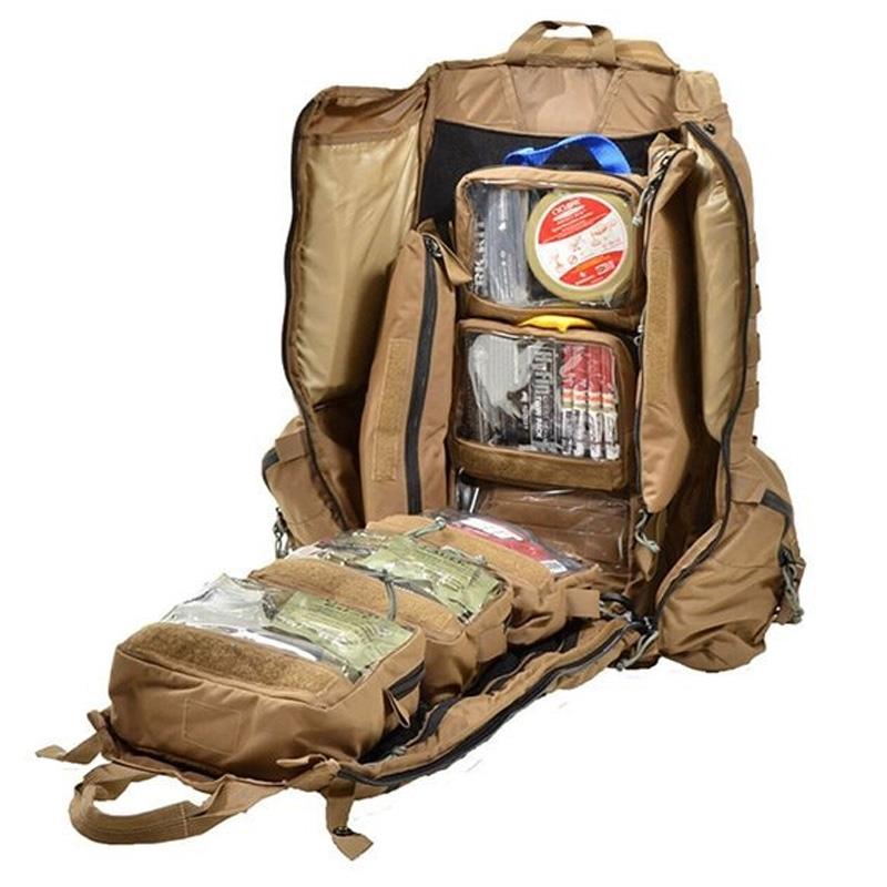 Characteristics: • Evolutionary backpack according to missions • NICE carrying frame for comfort and stability under the heaviest loads • Ventilation and stability system (BVS) on the frame • Adjustable FUTURA harness according to back length • Foam cushion on the back panel • Internal top handle for hanging the open bag • Internal waste bin to keep track of used items • 2 internal sleeves can accommodate splints and long items • Molle loops on the outside and on the belt • Zipped upper pocket for bandages and compresses • 1 large pocket and a zipped administration pocket on the front • 2 zipped side pockets • 8 internal Velcro® pockets • Padded abdominal belt • Patch location for identification • Volume: 56 liters • Weight: 5 kg • Approx. Dimensions: 78 x 51 x 31 cm • Waterproof 500D Cordura® and YKK® zips • Color: Coyote (COY) • Made in USA