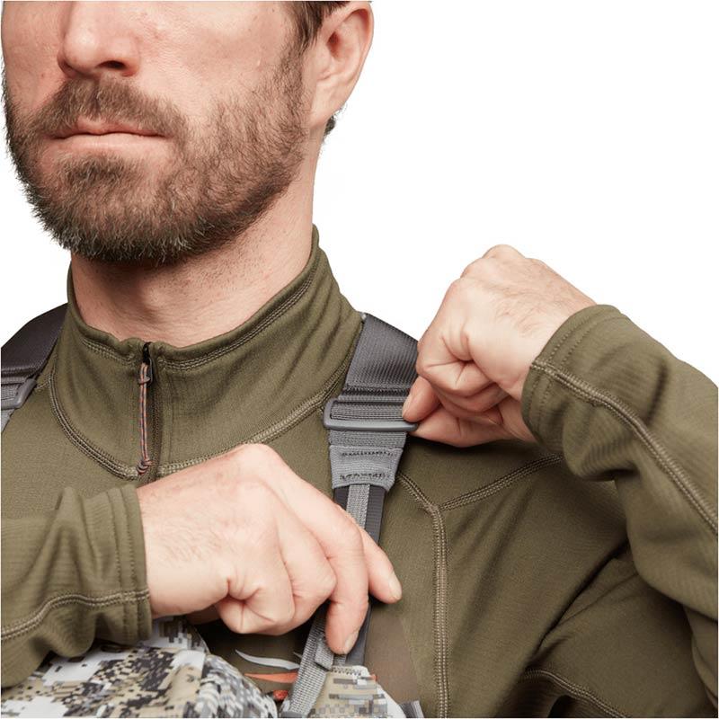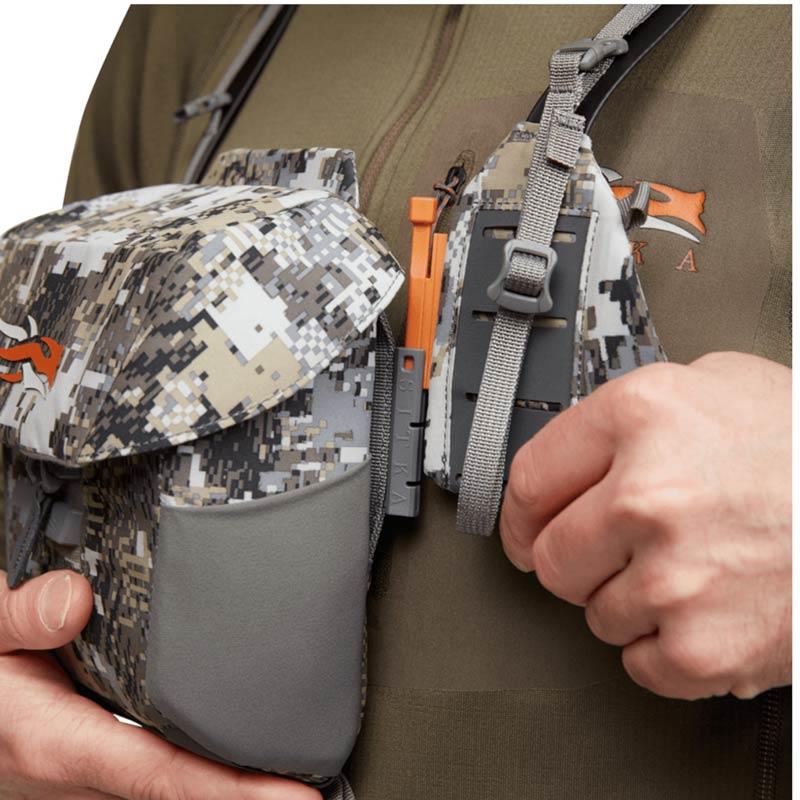 Relying on the proven legacy of our mountain optical harness, we have designed the Flash optical harness for full modularity and integration with your kit. This customizable harness for binoculars and rangefinders adjusts like a vest and can be put on and removed in a flash when wearing a hunting harness, a hood, or when hunting from a saddle. With limited straps, silent closures, and magnetic lids that stow away for easy access, this is the stealthiest harness ever designed.