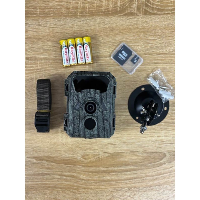 This pack includes : • 1 Chasseur.com trail camera • 4 AA batteries • 1 32 GB memory card • 1 mounting strap • 1 adjustable mounting bracket • 1 screw/anchor kit • 1 User manual in French/English/Spanish/German/Italian/Portuguese