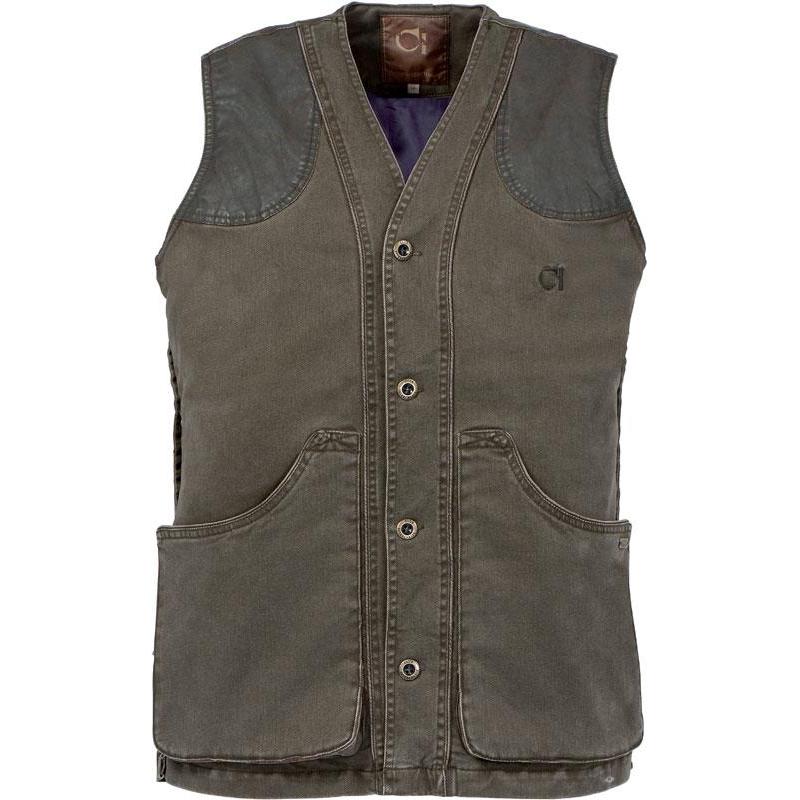 Hunting vest 97 % cotton, 3 % elastane, quilted shoulder panel 88 % cotton, 12 % resin, satin lining 100 % polyester. Large lower pockets, 2 internal zippered pockets, 1 mobile phone pocket, snap-closure game bag.