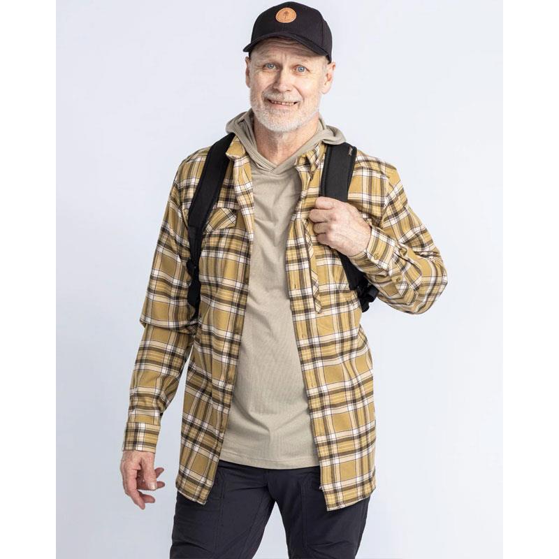 A soft and stretchy men's shirt with smart pockets and material properties that make it perfect for hiking.