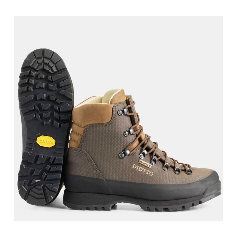 Features : • Upper: Natural leather treated with polyurethane, smooth finish (thickness 2,6-2,8 mm) • Upper features : Single cut with overlapping fold (DIOTTO patent) scratch-resistant • Upper protection : Rubber side band • Inner lining:Wind-tex • Thermal insulation: Rustproof brass pulleys • Small parts:Rustproof pulleys • Midsole :In microporous • Sole: Vibram Tsavo • Sole stiffness :Semi rigid • Weight:0.790 Kg • Height:20.00cm