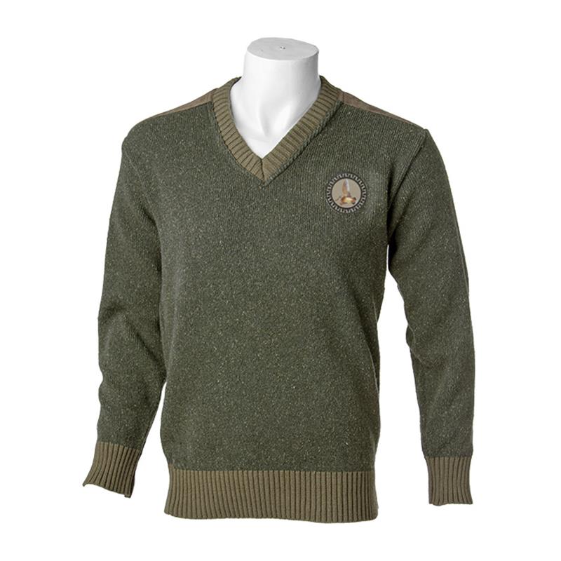 V-neck sweater jersey knit 30% wool. • Ribbed collar and ribbed edges on the sleeves and at the waist in contrasting colors. • Tone-on-tone suede-effect panels on the shoulders. • Garment washed and softened for a soft touch.