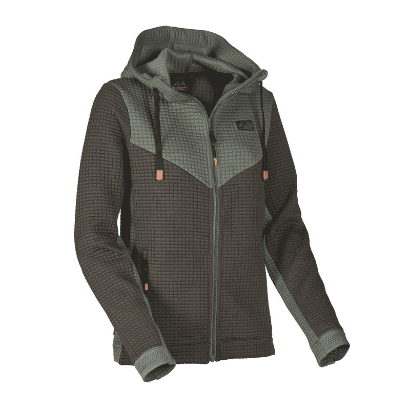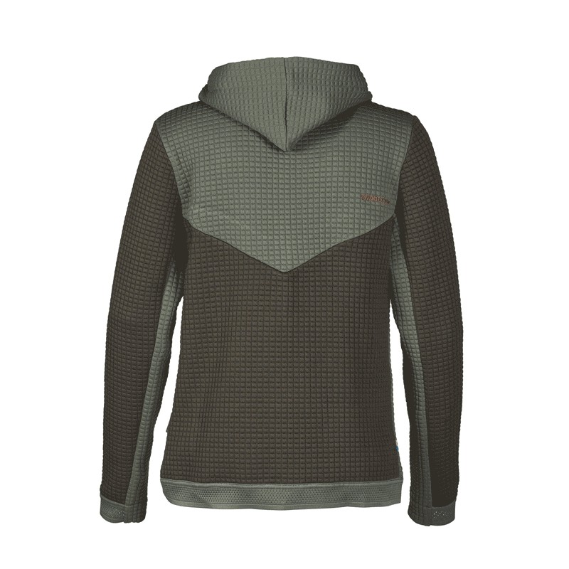 The jumper is made from a warm waffle-knit fabric and features a hood with a drawstring that offers extra warmth and protection when needed. It serves as a mid-layer in cold weather. It can also be worn as outerwear in dry weather. The jumper also has two pockets, elasticated cuffs, an elasticated waist, and a zip closure on the front.