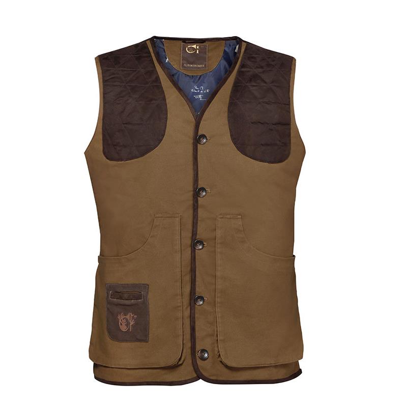 Features: • Hunting vest 96% cotton, 4% elastane. • Padded shoulder yoke in 100% polyester suede, lining 65% polyester and 35% cotton. • Large low pockets, 1 with an over-pocket. • Zipped game pocket. Game ring. • One zipped interior pocket.