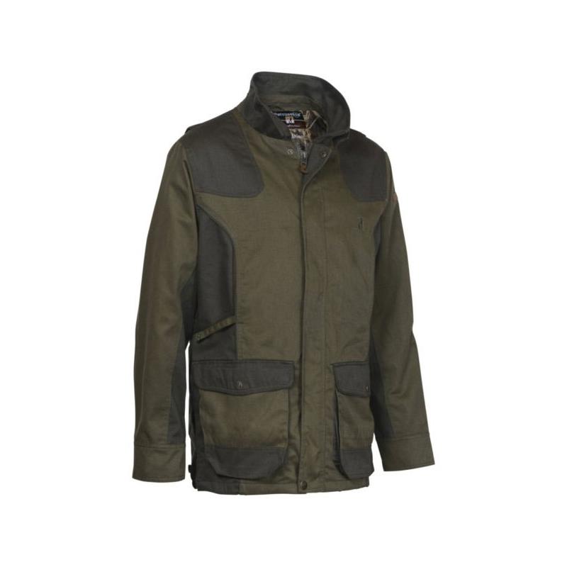 Features: • 65% polyester, 35% cotton, • water repellent treated, • 100% polyester lining. • Comfort gussets in the back, • reinforcements on the shoulders and elbows, • hand-resting pockets, • hold-open straps, • 2 large lower pockets with 2 rows of integrated cartridge belts (bullets and pellets) 4 interior pockets, • 1 phone pocket, • game carrier ring, game bag with waterproof and washable lining, detachable on 2 sides by snap button