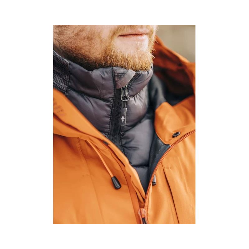 A 3-layer jacket that is extremely lightweight, windproof, waterproof, and stretchable. High-necked collar with well-thought-out ventilation holes. Fixed and adjustable hood. Sealed seams. This is an excellent jacket for active outdoor activities or daily use. It's a jacket that can withstand an exceptionally rainy and windy day. One-way zipper closure in the opening, two chest pockets, two hand pockets, all of them with zipper closures. On the sides, there are ventilation openings and the jacket's width is adjustable with a strap at the bottom. Treated with organic-Bionic Finish® Eco impregnation for additional water-repellent and anti-stain properties.