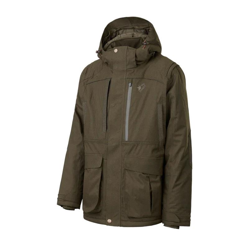 Features: • Material: - Silent chevron - all seams waterproof - waterproof and breathable membrane 10,000 / 10,000 • Front: - Removable and adjustable padded hood - large volume zippered chest pockets - warm hand rest pockets - lower pockets with double entry, protection flap - integrated cartridge holders - cuffs adjustable by velcro - integrated protection cuffs - adjustable jacket bottom • Back: - Large game bag pocket - 3-point opening • Interior: - duvet style inside