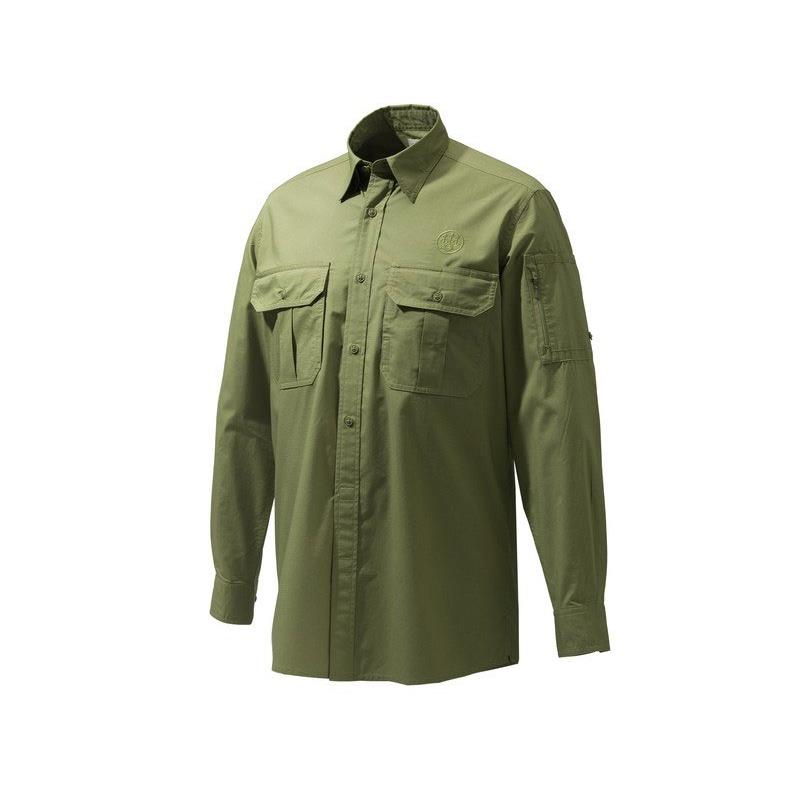 Features : • Hidden button-down collar. • Closure with buttons and velcro. • Patch chest pockets with two compartments • Sleeve pocket with YKK zipper and pen holder • Roll-up sleeves • Embroidered Beretta logo • Fit : Regular fit