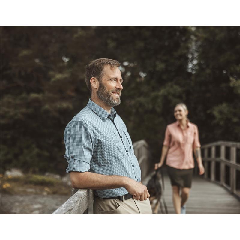 An stretchable and breathable shirt made of wrinkle-free material with a ventilation opening in the back. Keep your cool in hot weather! Comfortable men's shirt made of stretch material, offering a perfect mix of comfort and functionality. It is equipped with built-in UV protection and an impregnation that effectively repels mosquitoes and ticks from the fabric. The fabric itself excels in breathability, and the shirt has a ventilated mesh opening in the back to optimize air circulation, making it the ideal choice to stay cool in hot weather. Not only is this shirt lightweight, but it remains wrinkle-free for long periods, making it a comfortable choice whether you take it on outdoor adventures or wear it daily to avoid the hassle of ironing. The shirt has two zippered chest pockets and an internal hanger for easy hanging after washing. It is the perfect companion for camping, hiking, or any other outdoor activity where you need a lightweight but functional shirt.
