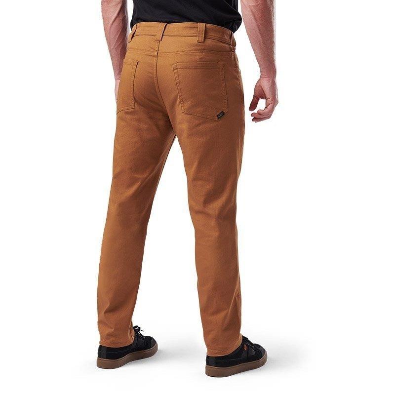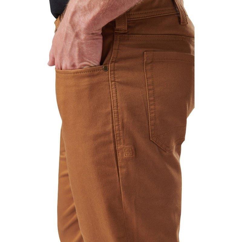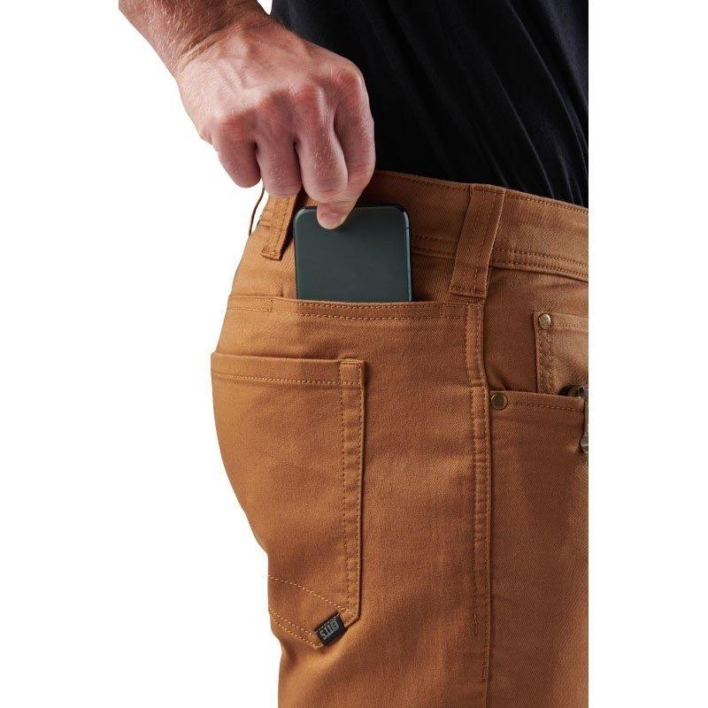 Features: • Lightweight and stretchy 5 pocket style pants • Slim fit, narrow at the bottom of the legs • Total of 7 pockets • 2 pockets at the back of the hips for 2 magazines • 2 patch back pockets • 2 hand pockets with N6 reinforcements for clip accessories • 1 coin pocket like jeans • Reinforced belt loops • 5.11 woven label [+] at the bottom of the right rear pocket • Embroidery [+] on the side seam of the left hip • Body: 66% cotton/ 31% polyester/ 3% elastane, 8.8 oz • Pockets: 80% polyester/ 20% cotton, 3.0 oz, Atmos print