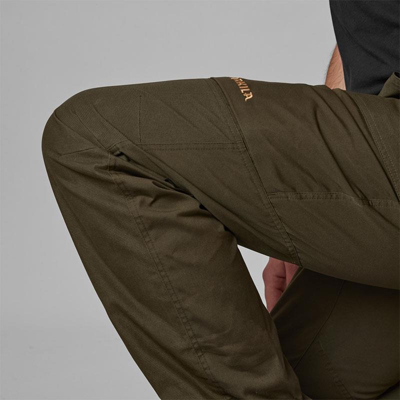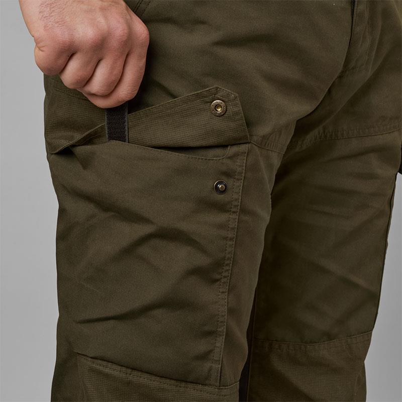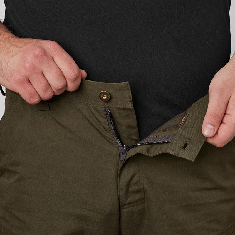Features: • Peach skin coated fabric 65% polyester/35% cotton • Jean type button fly • D ring on the left • Slant front pockets • Large cargo pockets compartmentalized by Velcro • Preformed knees • Raw hem