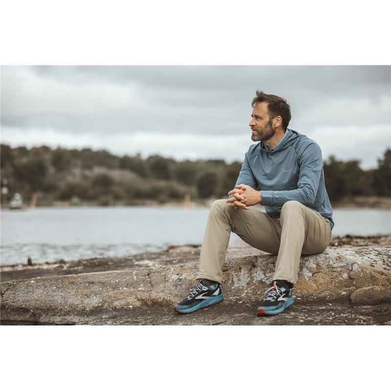 Lightweight, 4-way stretch pants, in quick-drying fabric, with UV protection against the sun. These flexible men's pants feature 4-way stretch and UV sun protection. The fabric is fitted with a ripstop function that prevents potential tears from spreading. It is bluesign® certified, meaning it has been manufactured according to strict safety and environmental standards. In addition, this pant dries quickly and is treated with an impregnation that repels mosquitoes and ticks from the fabric. The leg ends are adjustable with drawstrings for a tighter fit, and the waist is equipped with a belt with a handy plastic buckle. The pants are fitted with two zippered pockets on the legs, two open hand-level pockets, and a small hidden security pocket with a zipper inside one of the pockets to securely store keys or similar items. Lightweight and easy to pack in your bag, they are perfect for travel. The remarkable elasticity of these trousers ensures their comfort and does not hinder movement.